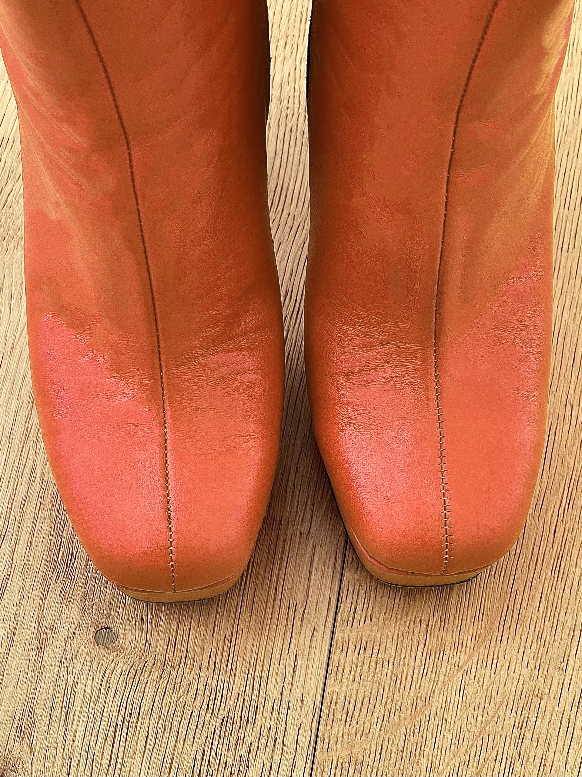 Vysoké kozačky s hranatou špičkou a širokým podpatkem.