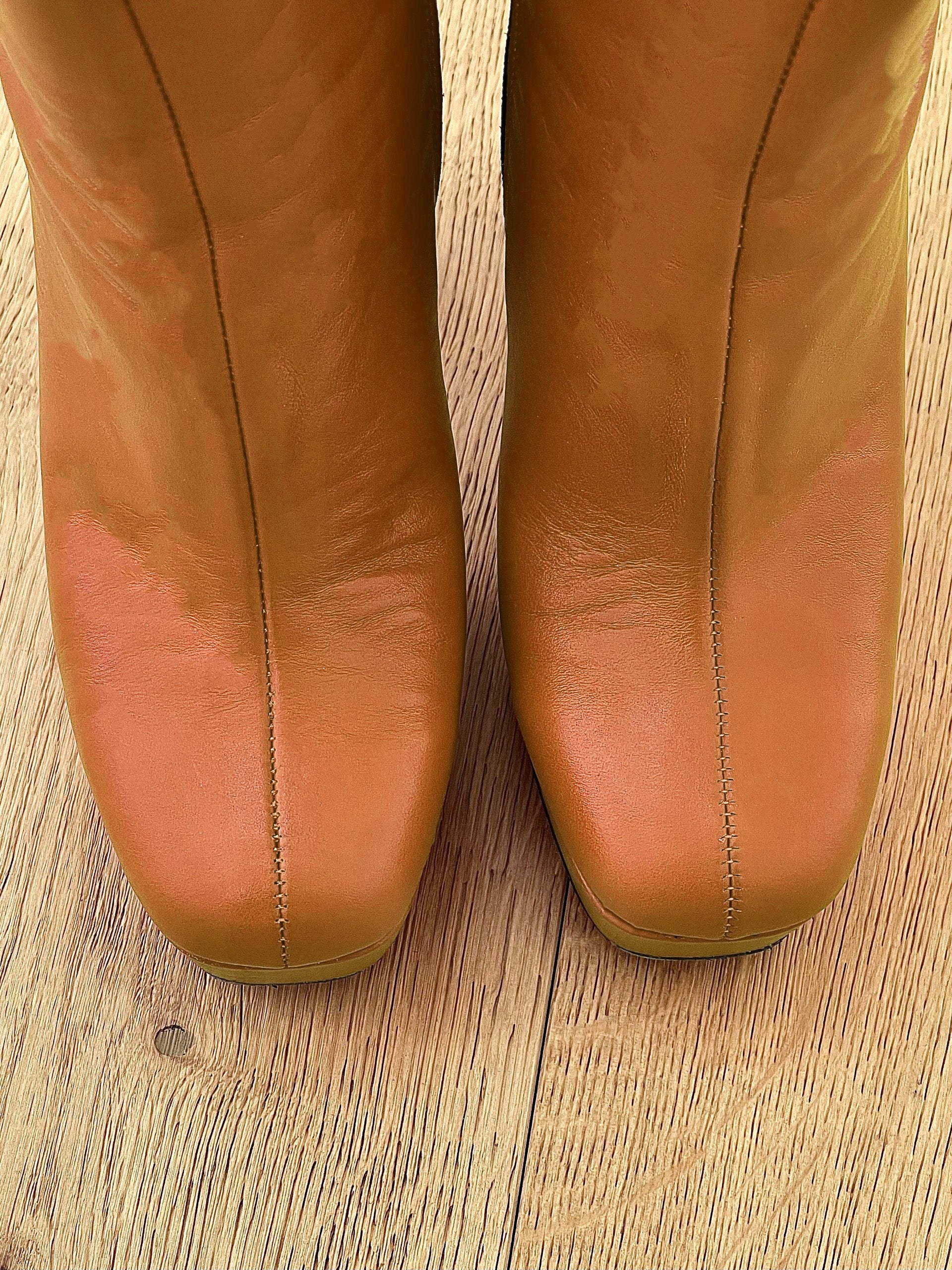 Vysoké kozačky s hranatou špičkou a širokým podpatkem.