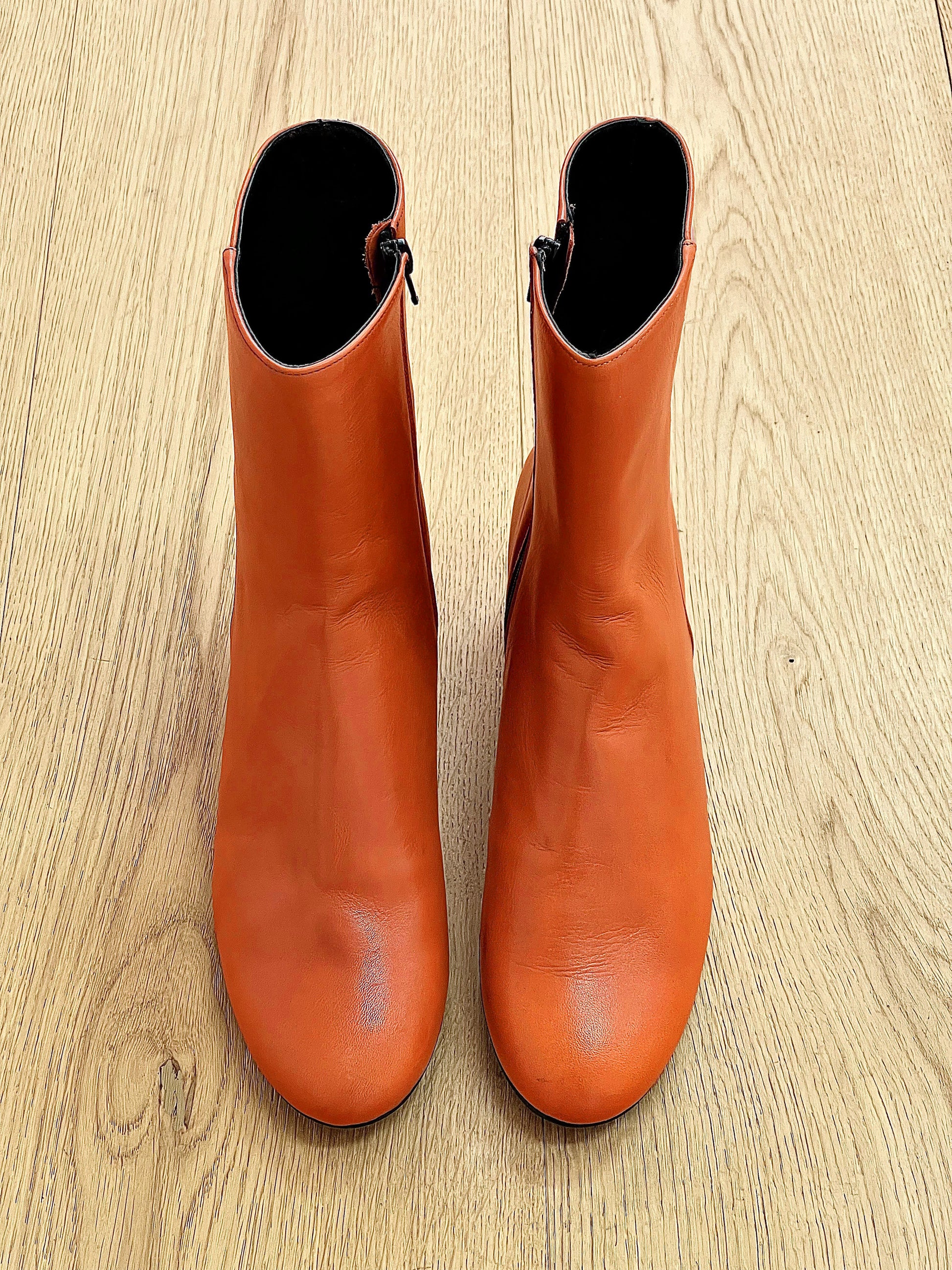 Nízké kotníkové boty s kulatou špičkou a širokým podpatkem.