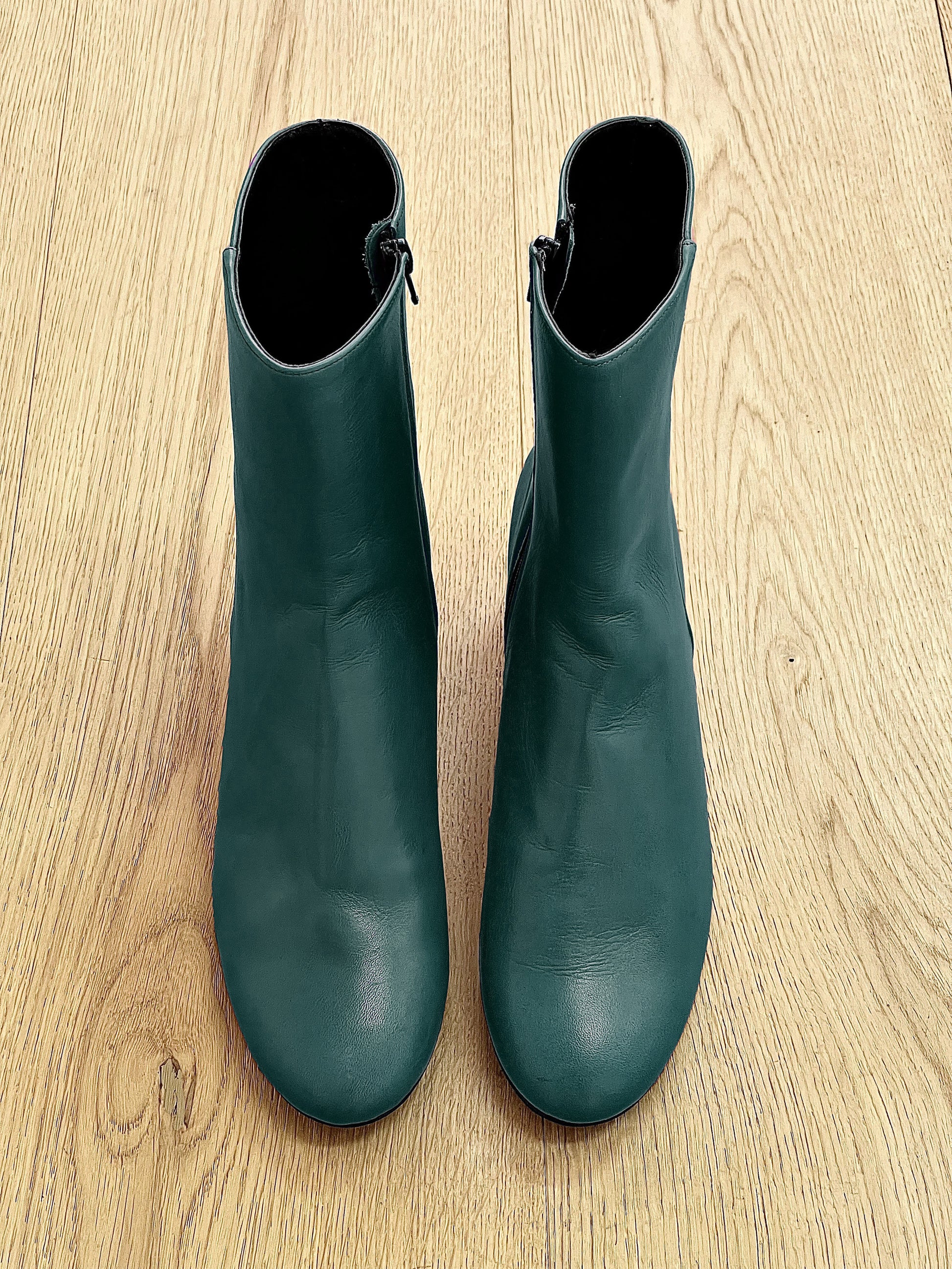 Nízké kotníkové boty s kulatou špičkou a širokým podpatkem.