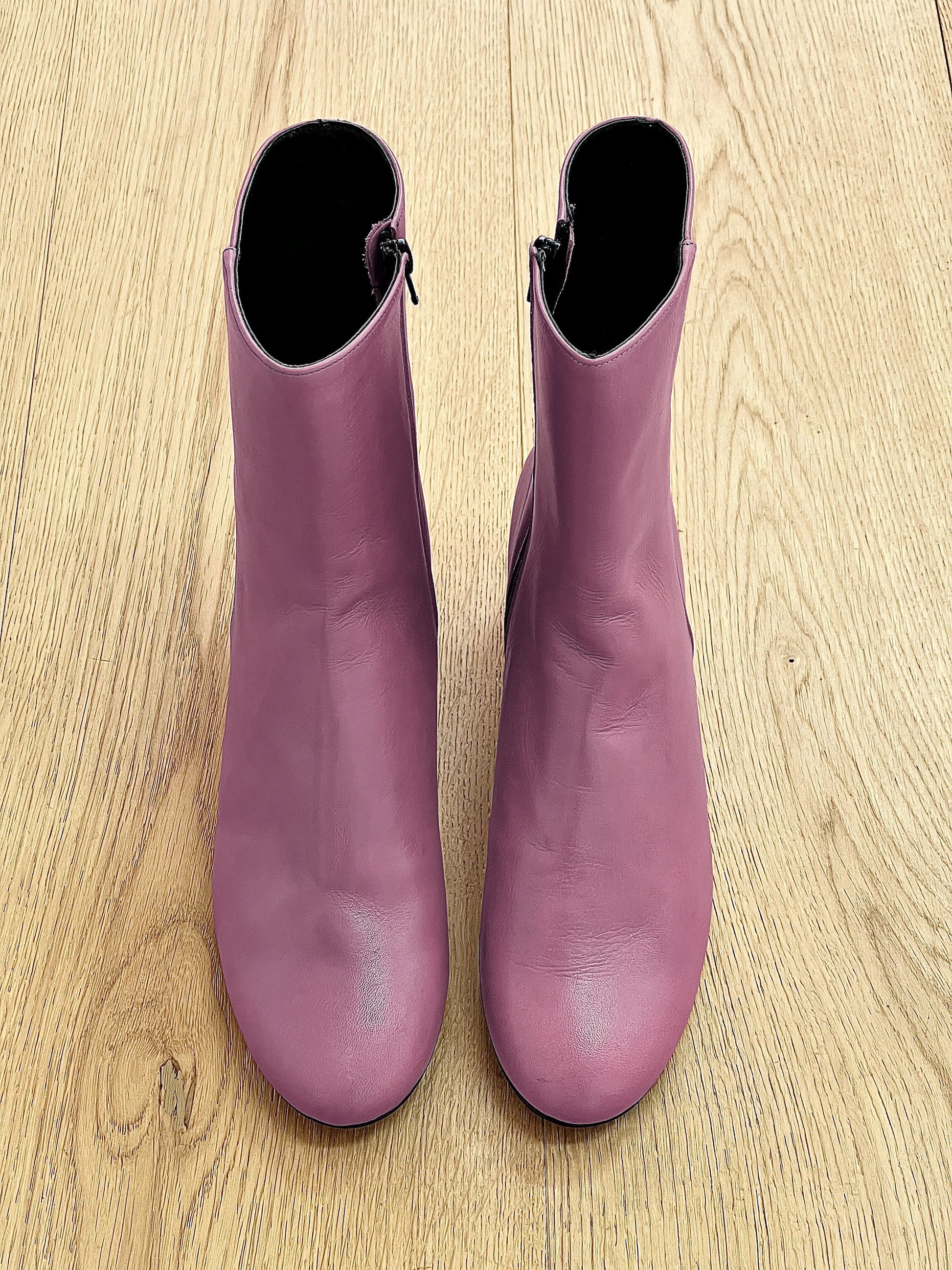 Nízké kotníkové boty s kulatou špičkou a širokým podpatkem.