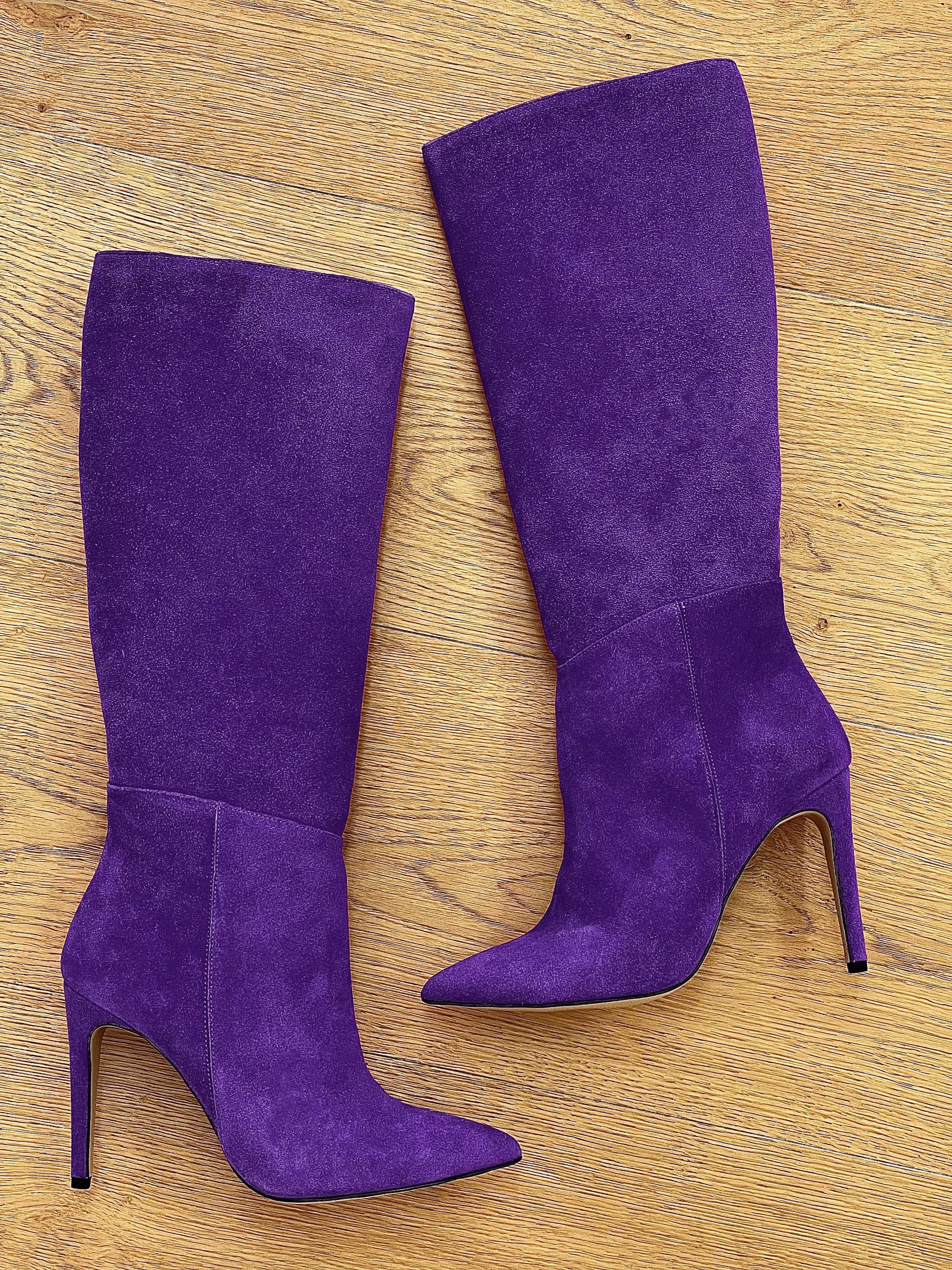Semišové kozačky na špičce s 10cm jehlovým podpatkem.