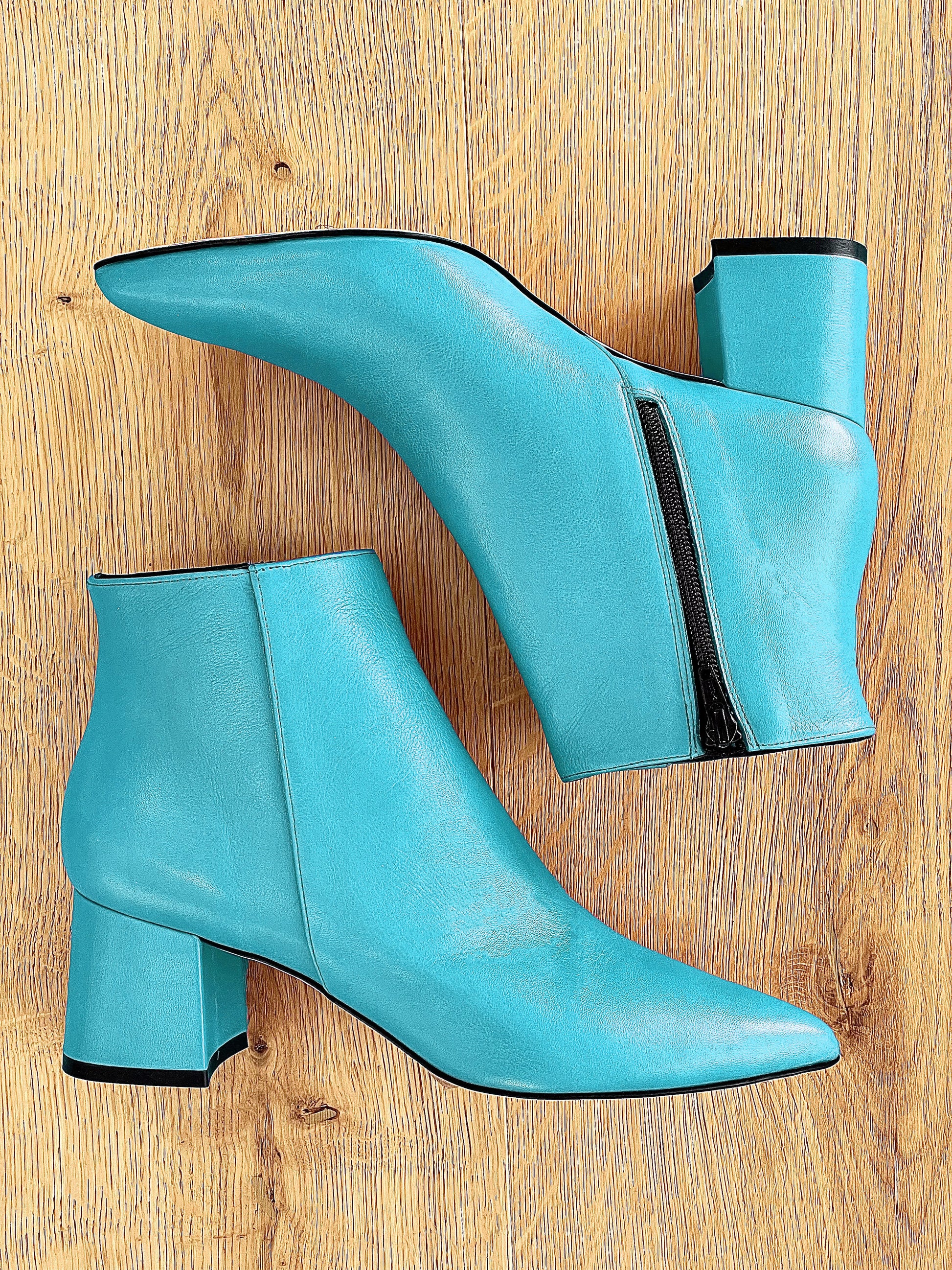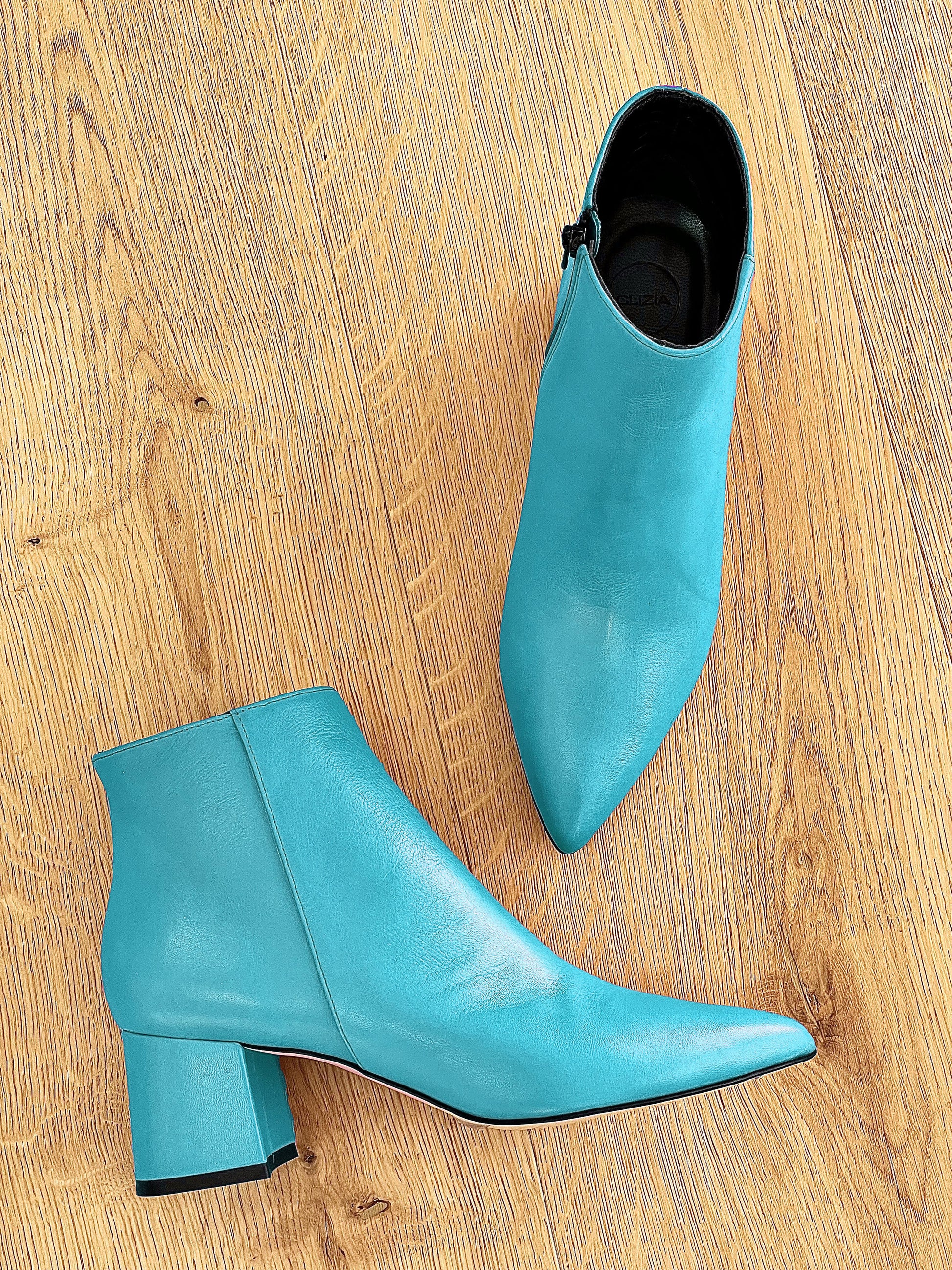 Kožené kotníkové boty se špičatou špičkou a širokým podpatkem.