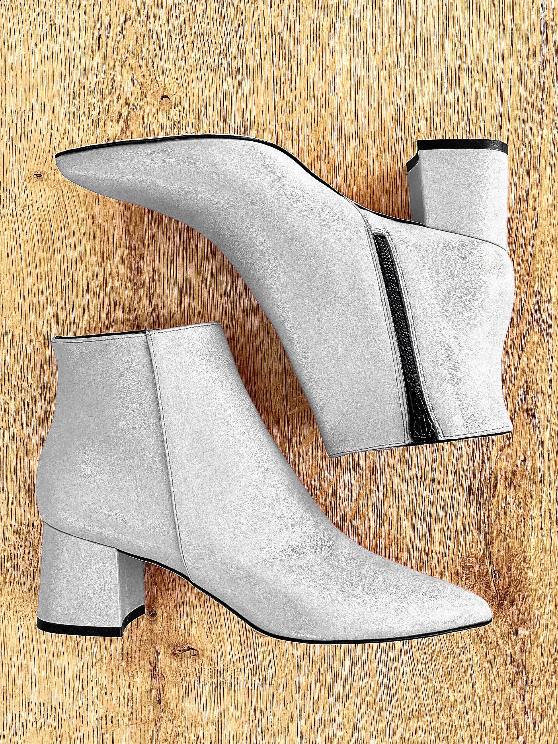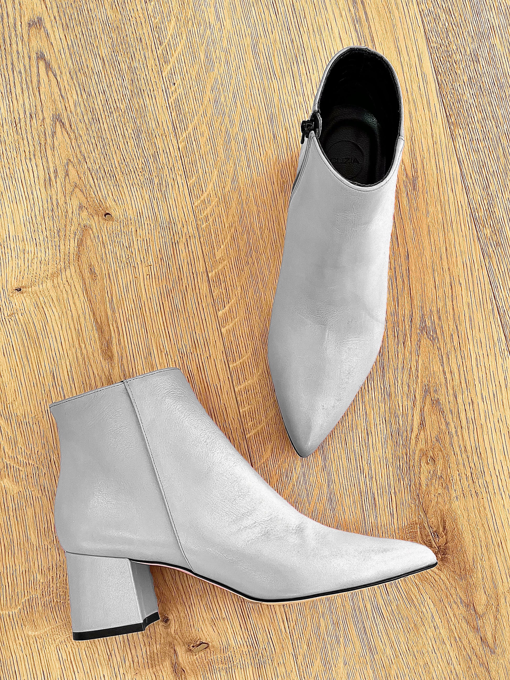 Kožené kotníkové boty se špičatou špičkou a širokým podpatkem.