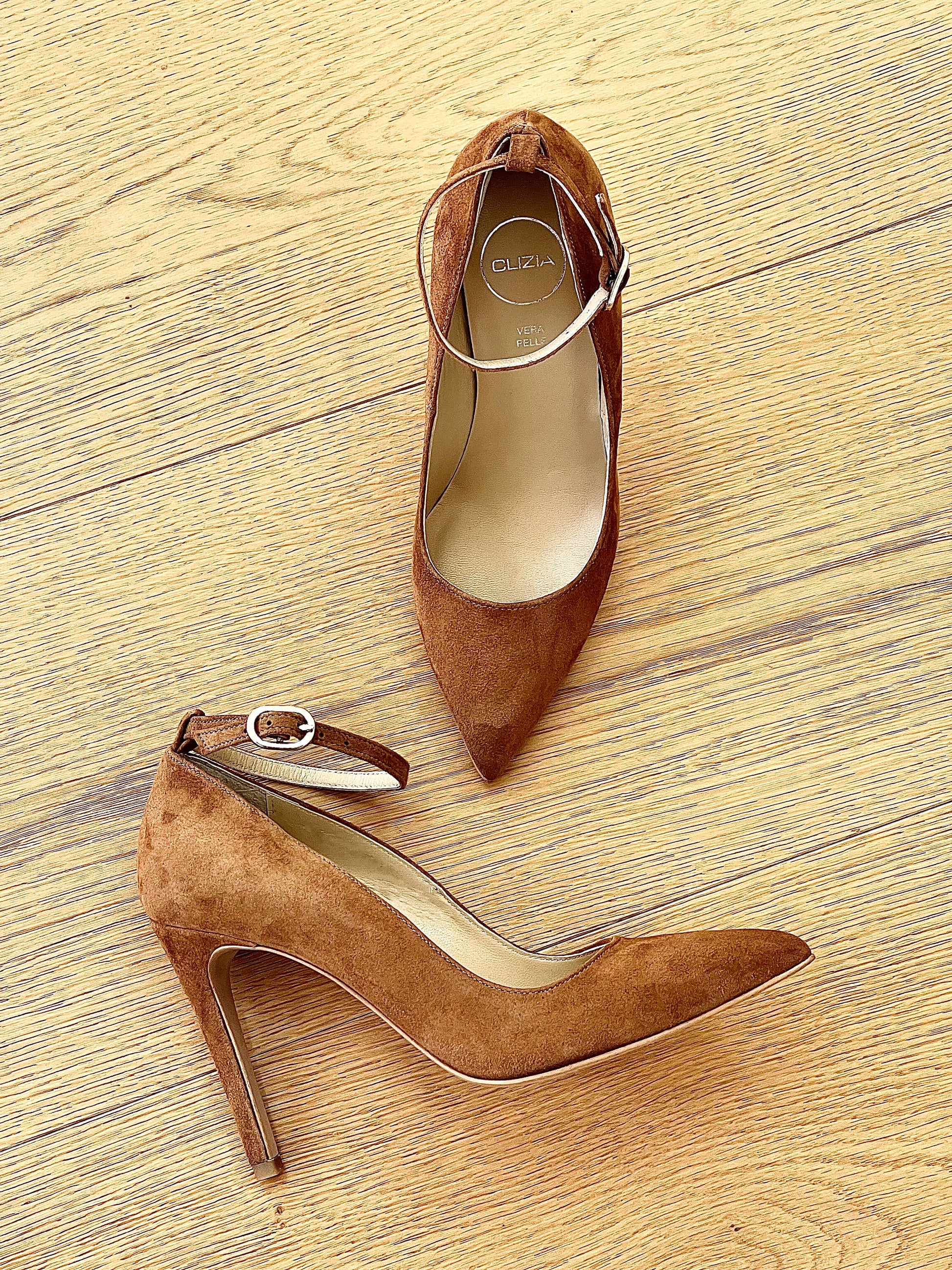 Hohe Pumps aus Wildleder mit Knöchelriemen.