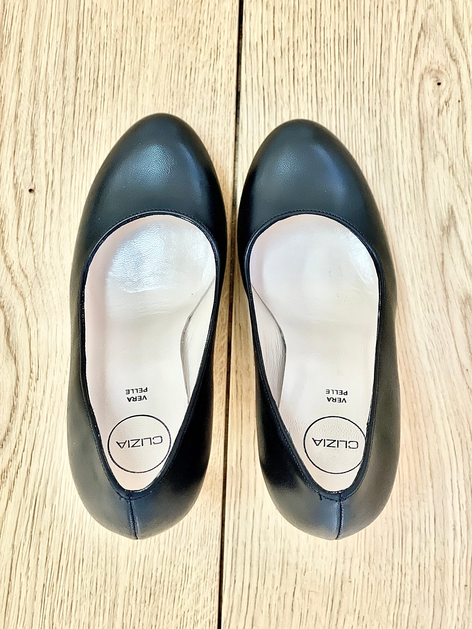 Pumps mit runder Spitze aus Leder, 10 cm hohem Absatz und 1 cm Plateau.