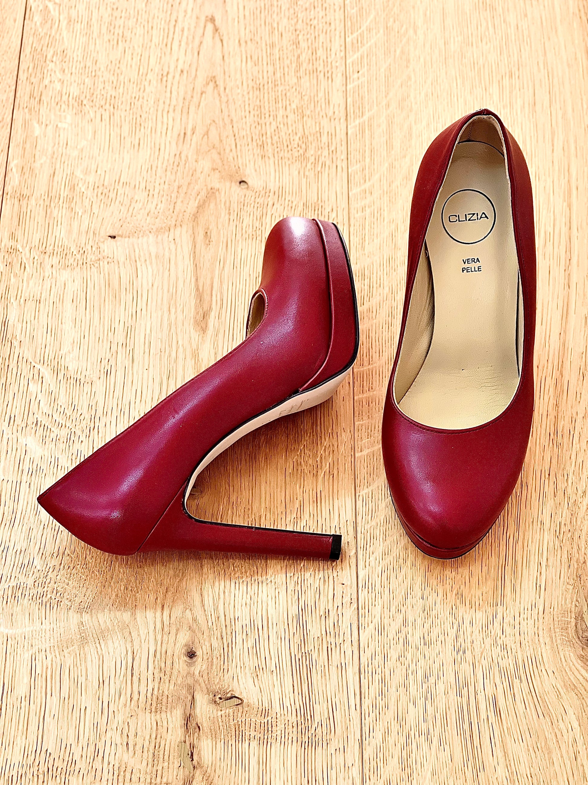Pumps mit runder Spitze aus Leder, 10 cm hohem Absatz und 1 cm Plateau.