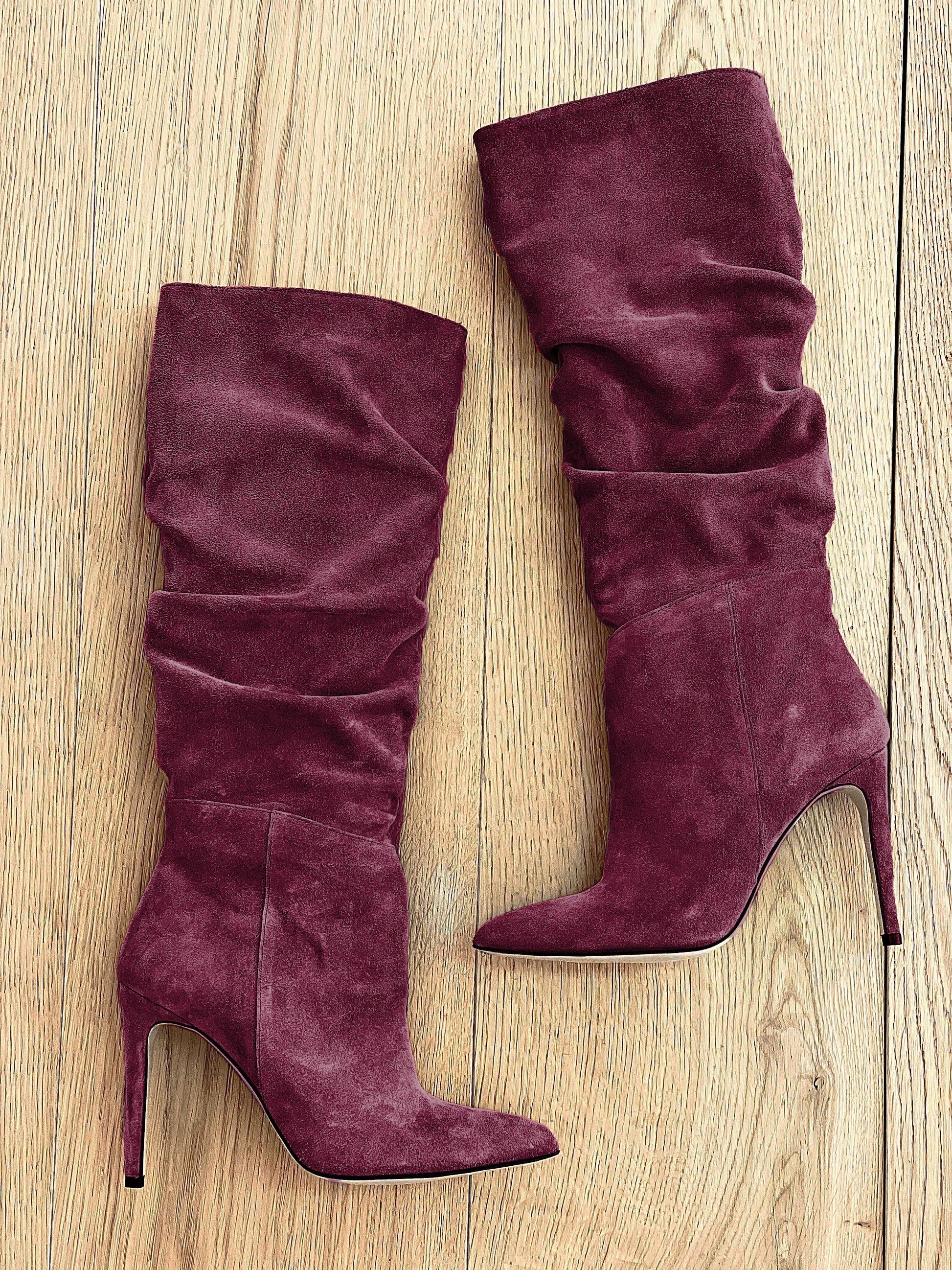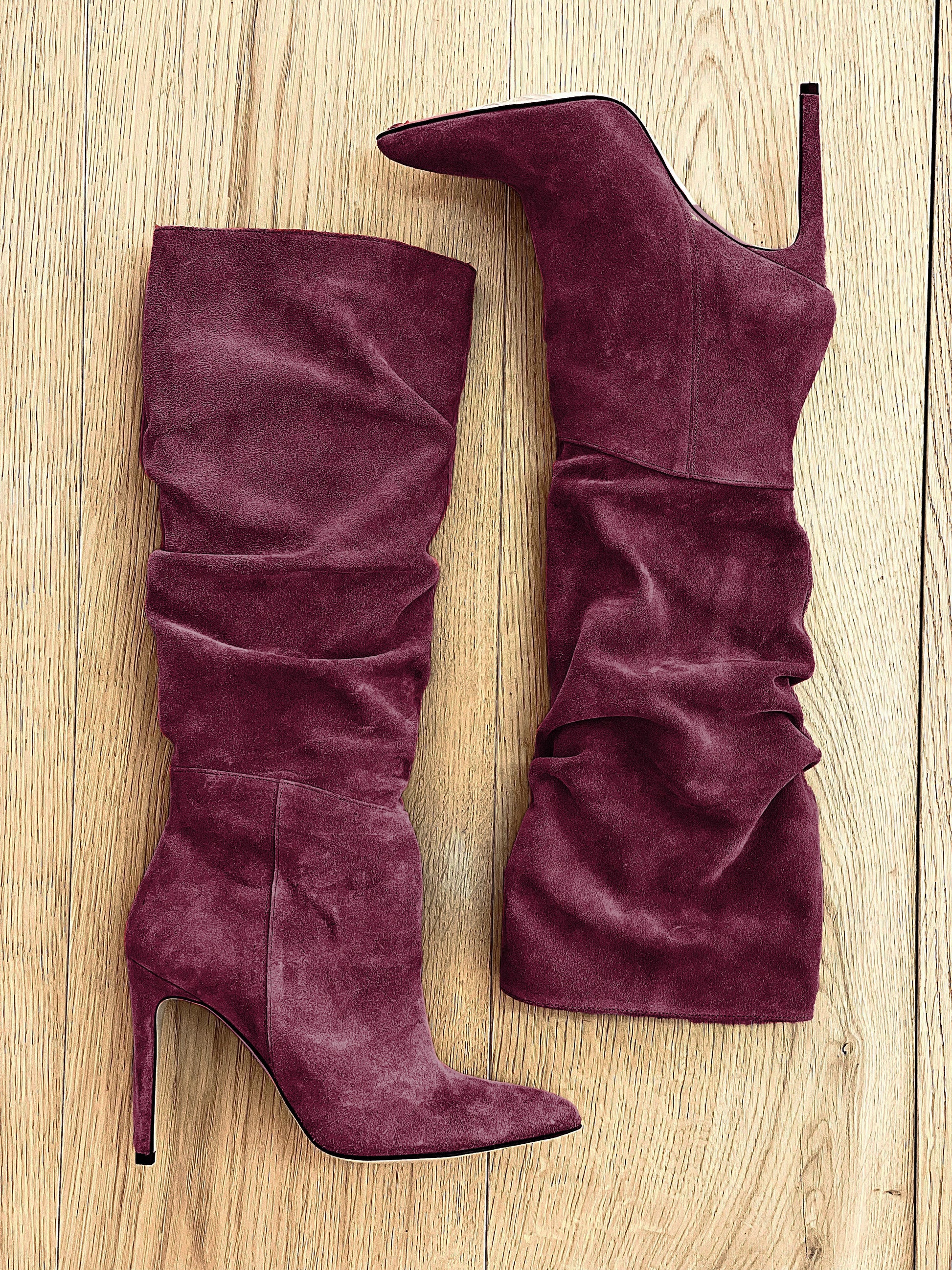 Hoch sitzende schlauchförmige Wildlederstiefel mit Stilettoabsatz.
