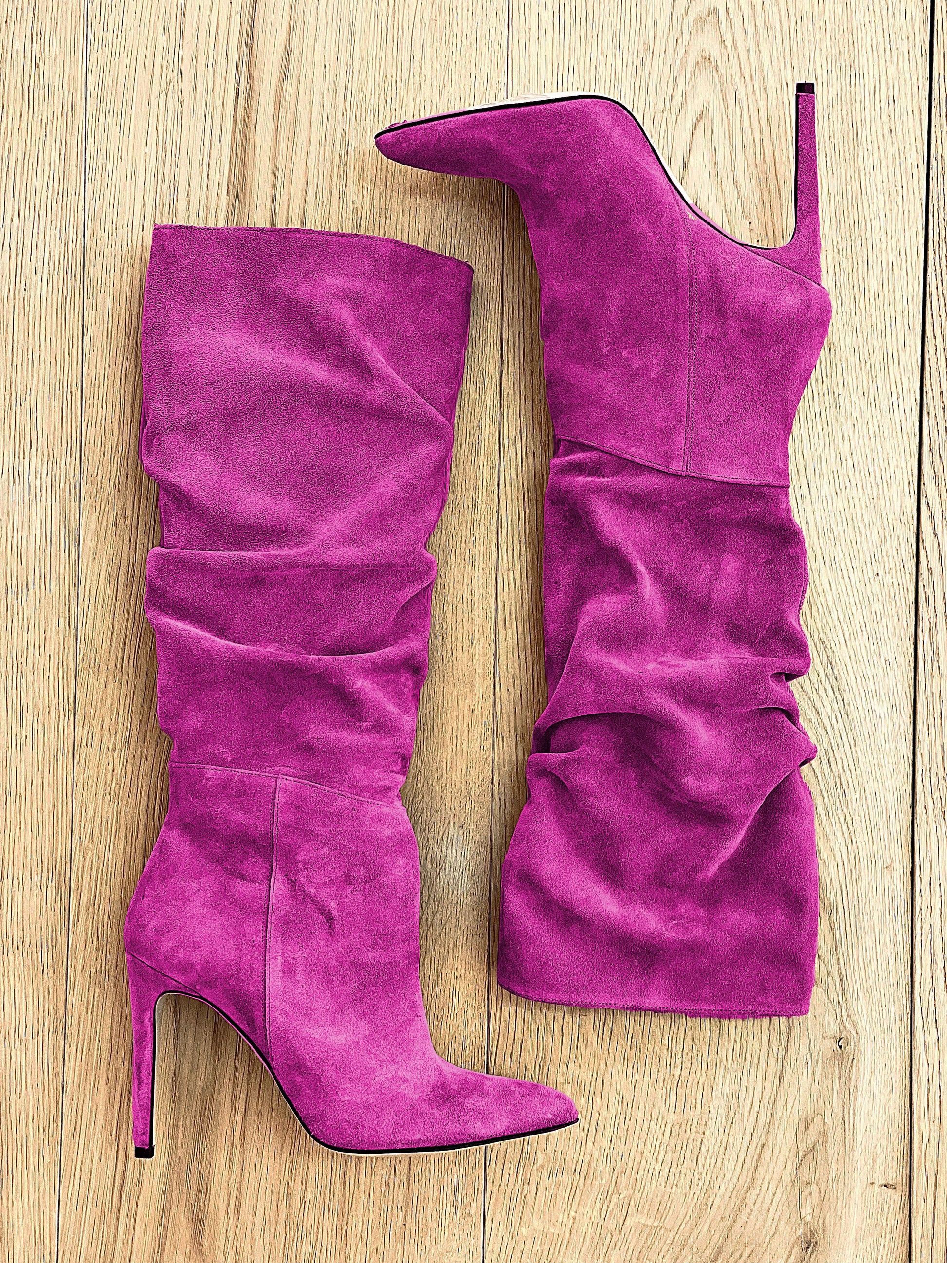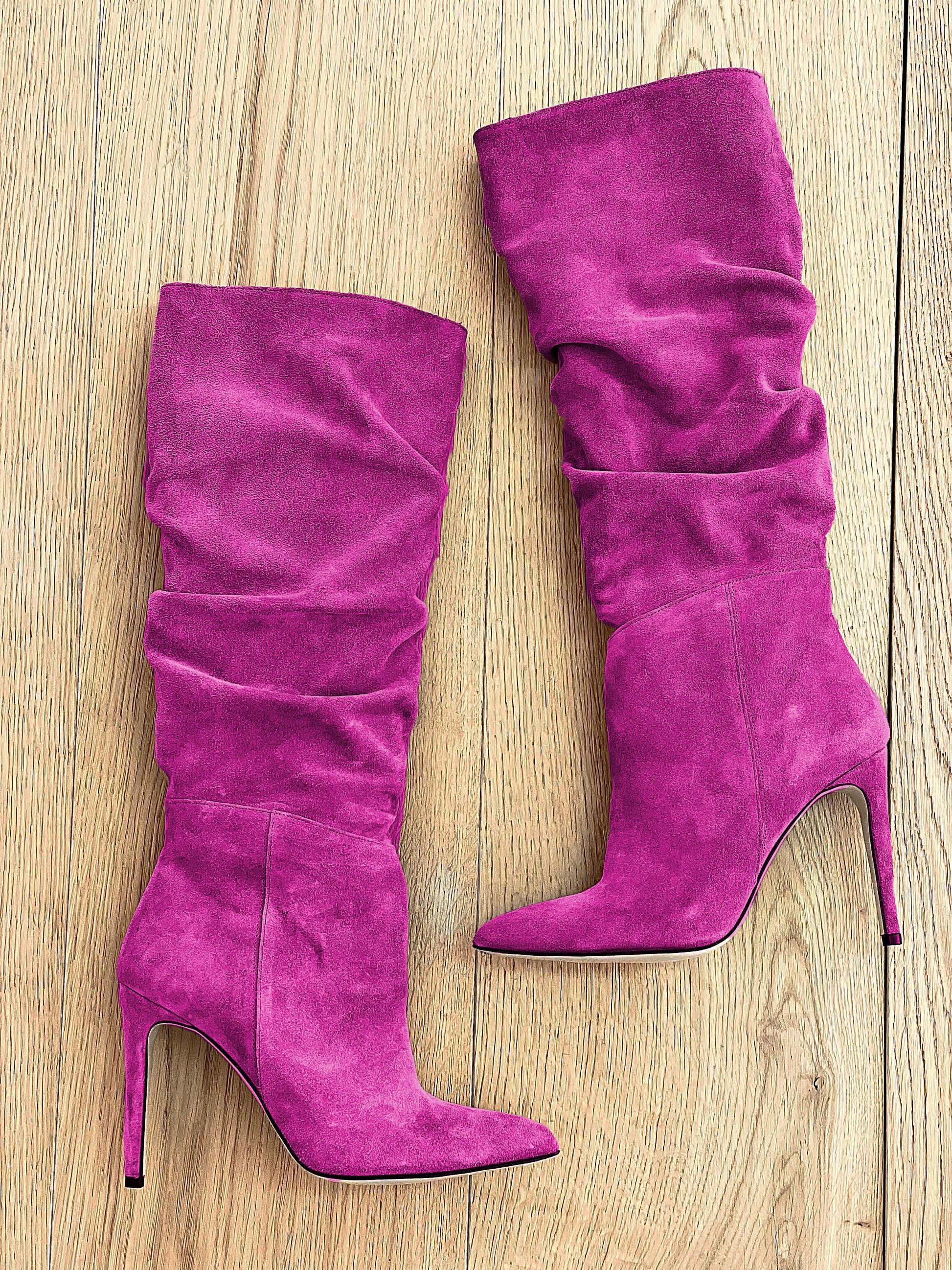 Hoch sitzende schlauchförmige Wildlederstiefel mit Stilettoabsatz.