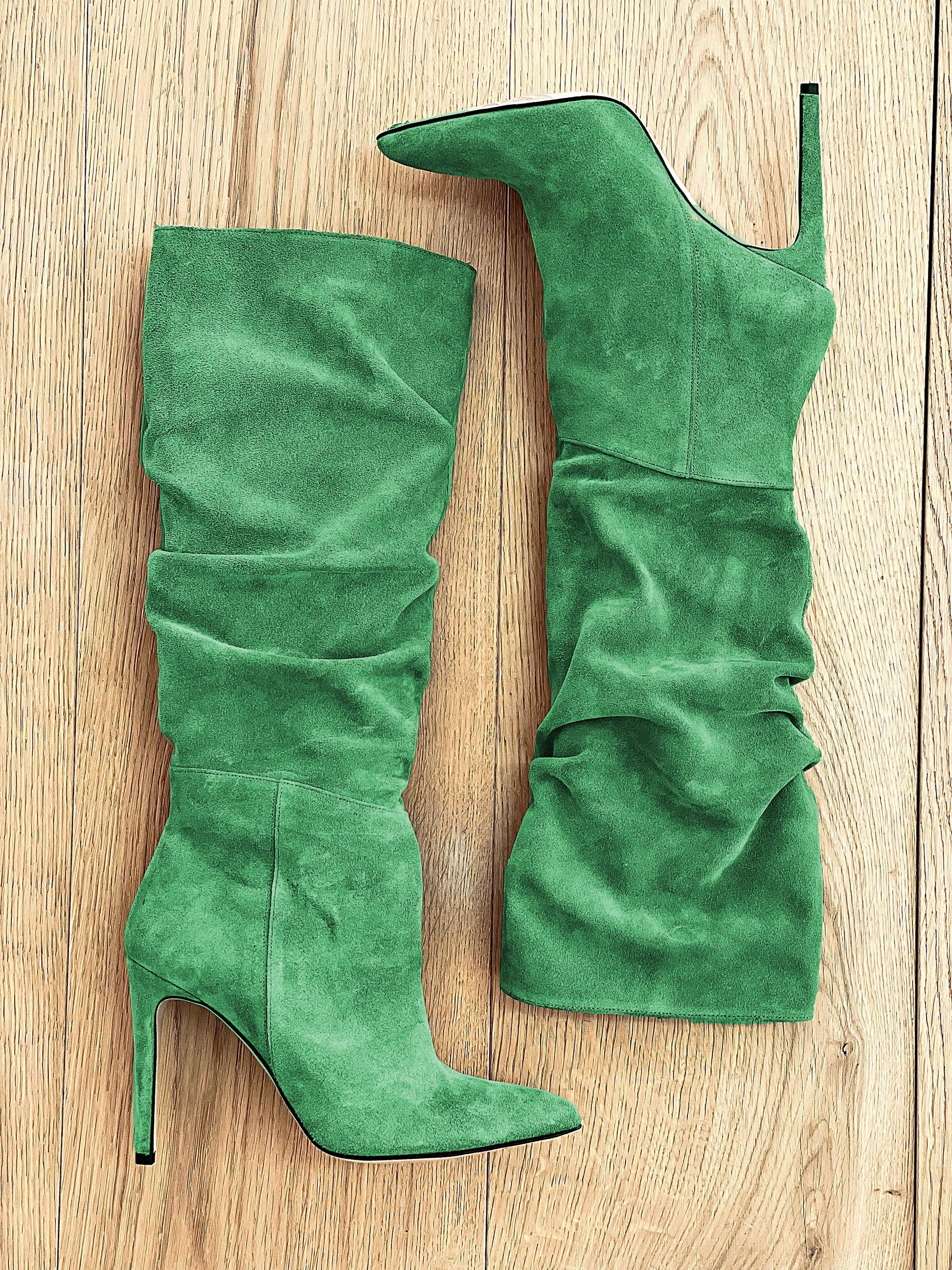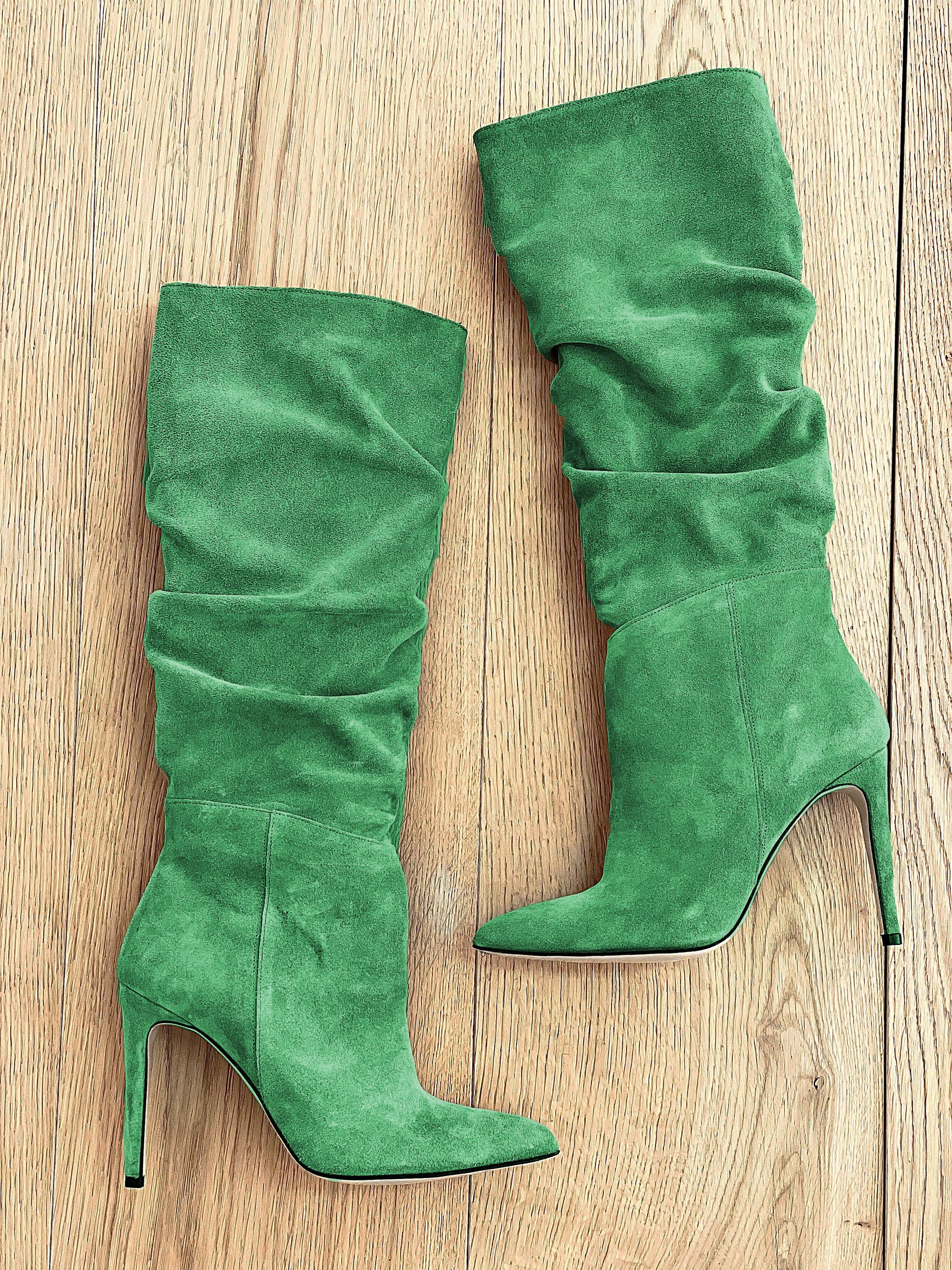 Hoch sitzende schlauchförmige Wildlederstiefel mit Stilettoabsatz.