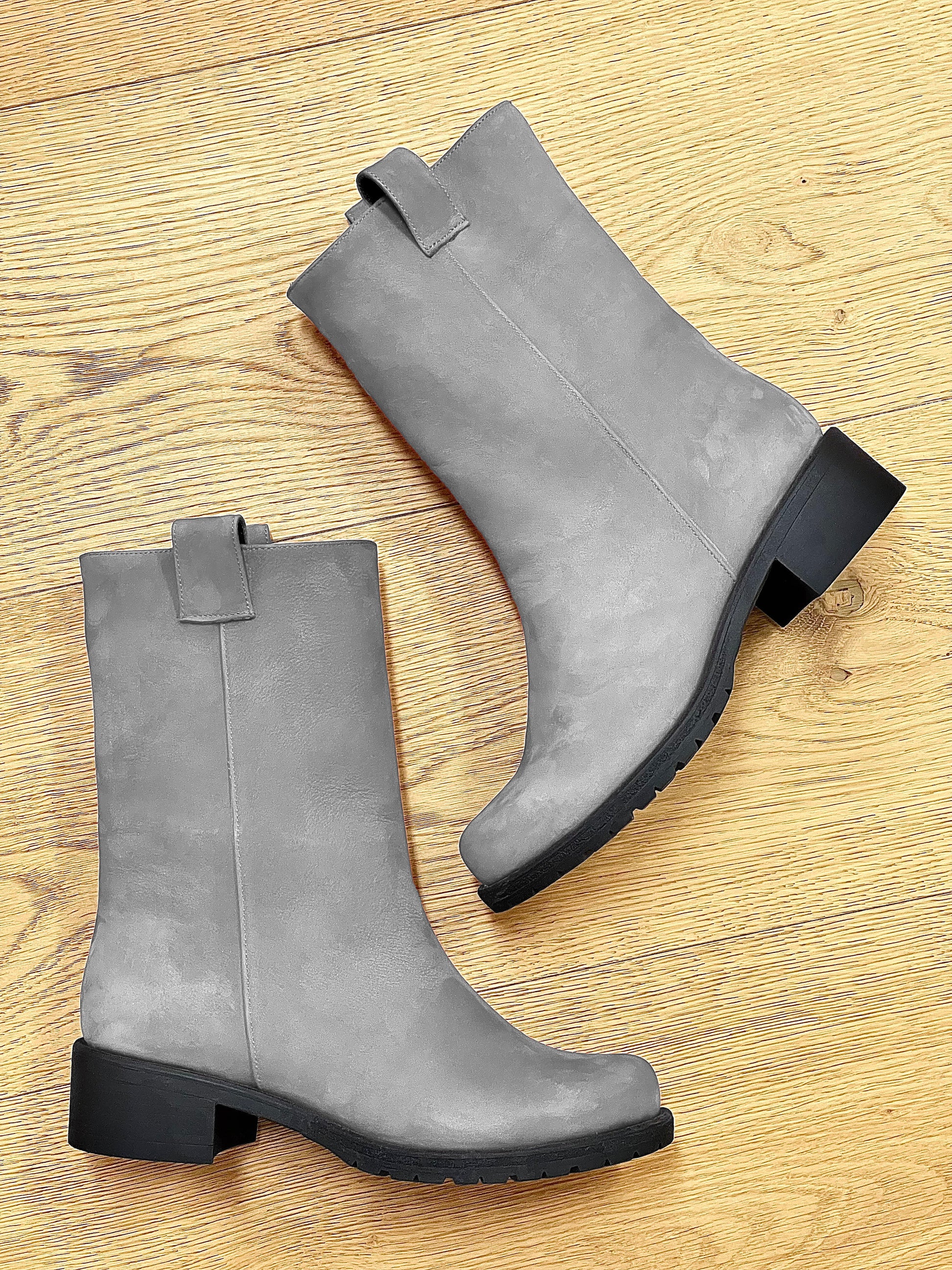 Röhrenförmige Wildlederstiefel mit runder Spitze.
