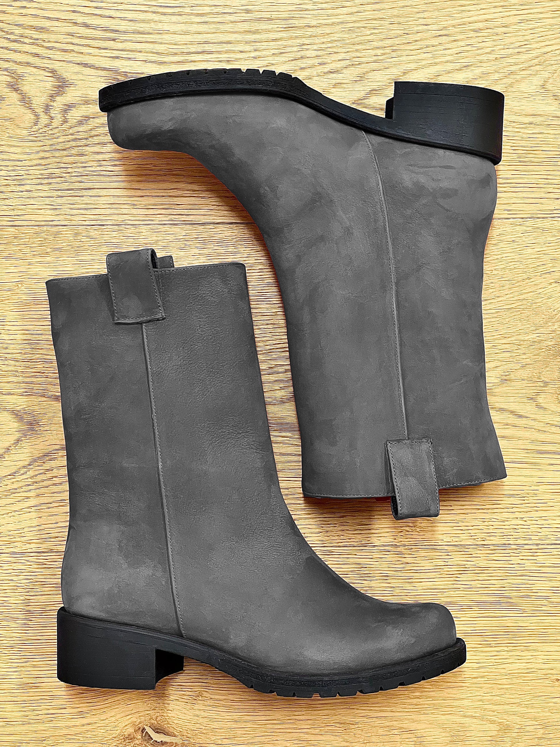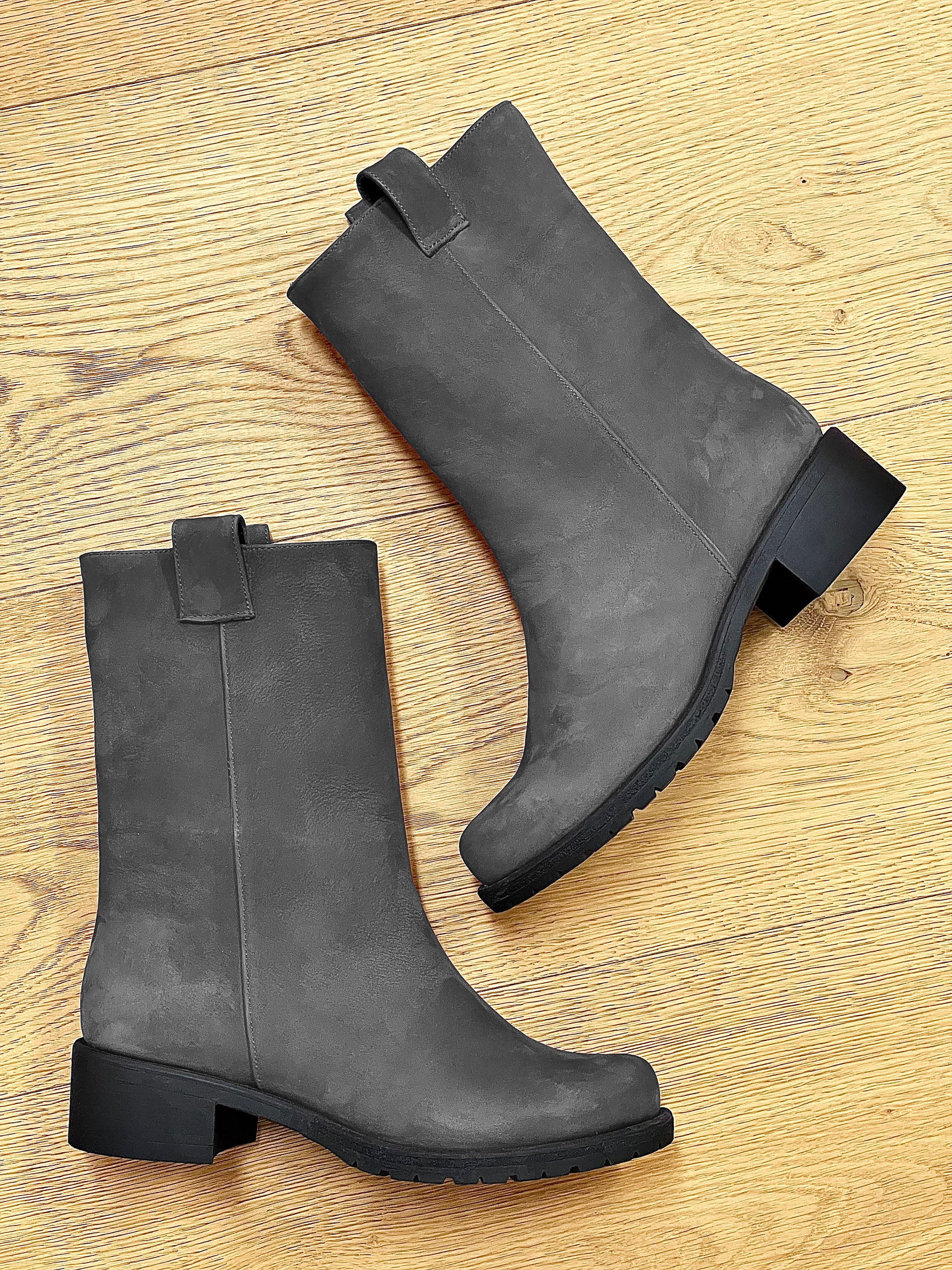 Röhrenförmige Wildlederstiefel mit runder Spitze.