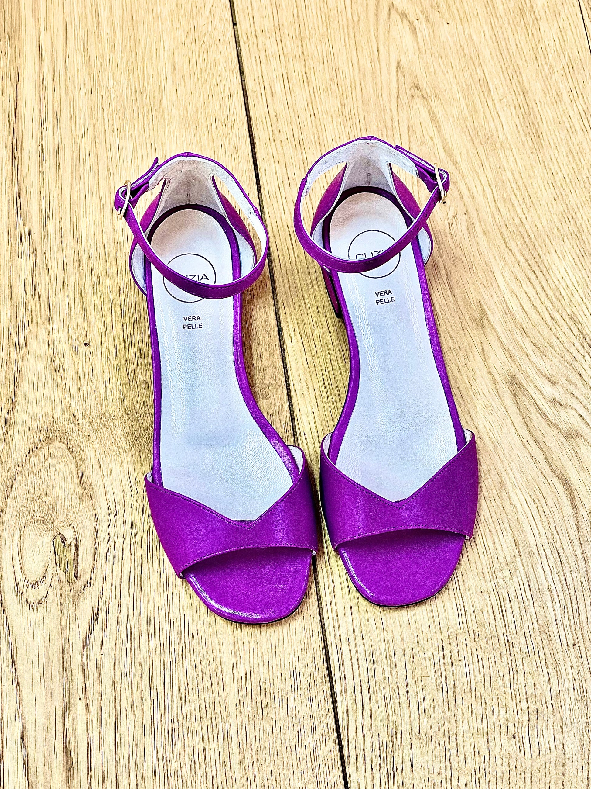 Niedrige Ledersandalen mit Band und Absatz, V-Ausschnitt und 2 cm Absatz.
