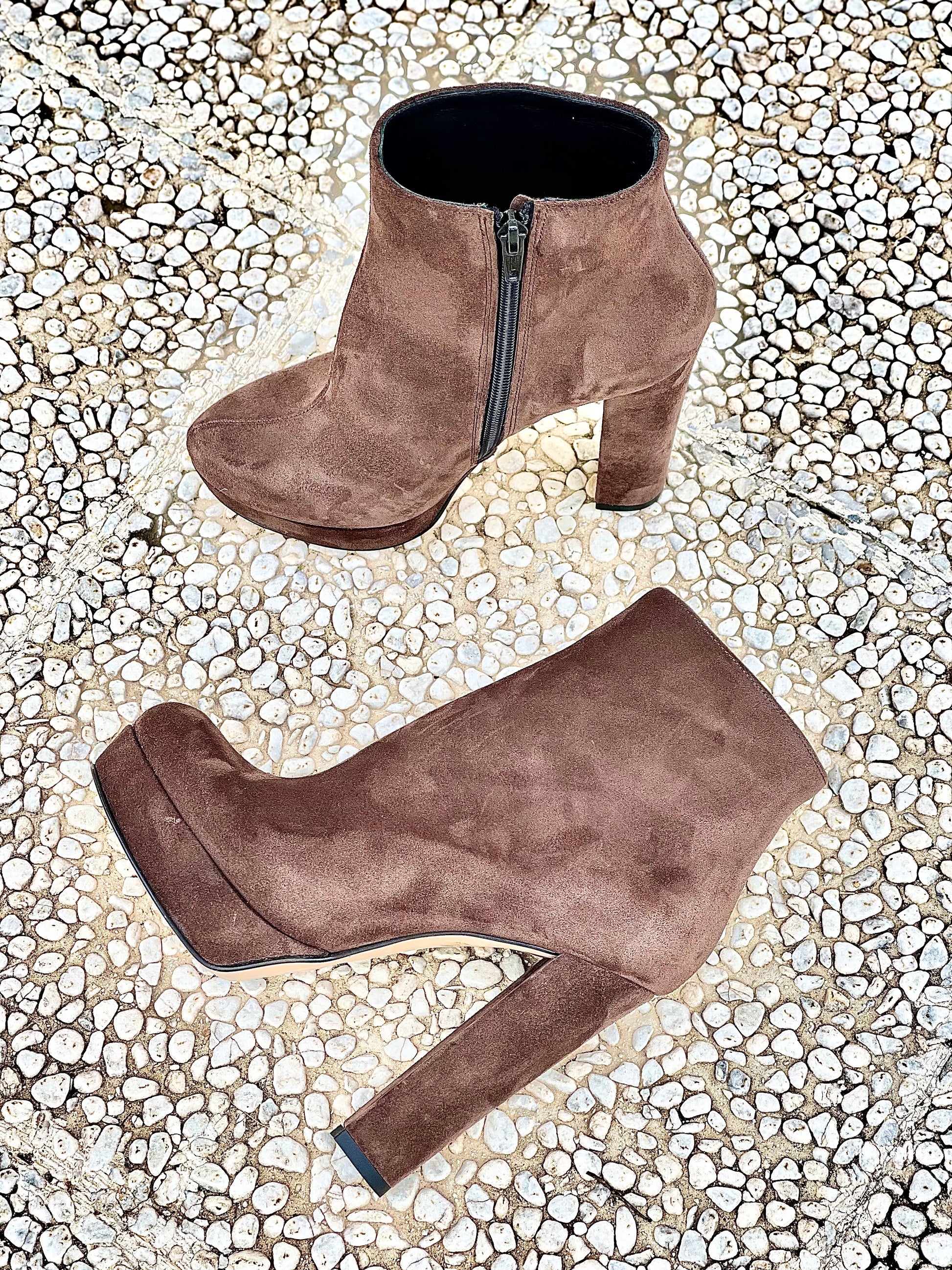 Stiefelette aus Wildleder, 12 cm Absatz und 2 cm Plateau mit Innenreißverschluss.