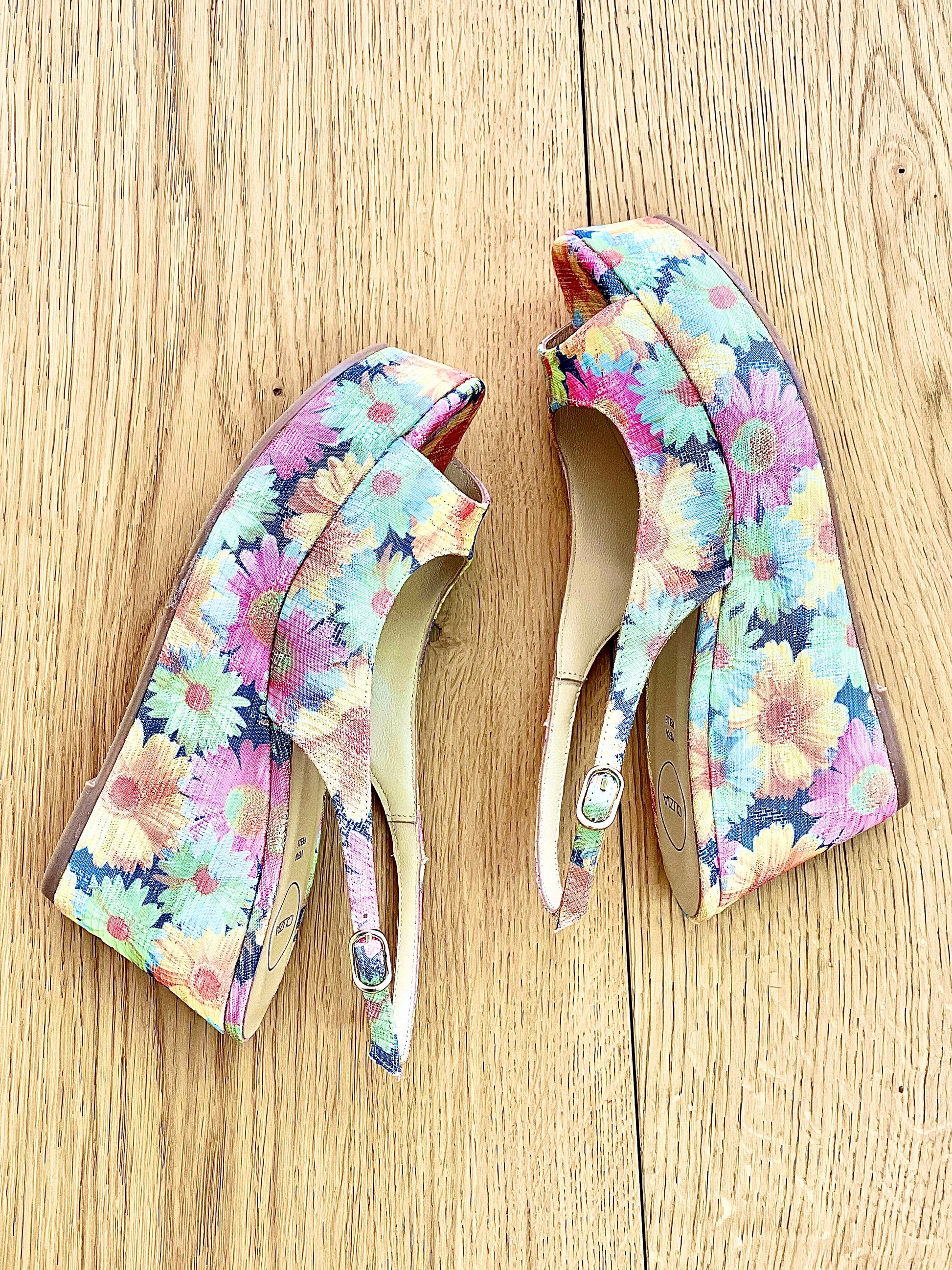 Zehenoffene Slingback-Pumps mit mehrfarbigem Blumenmuster auf mittlerem Keil.