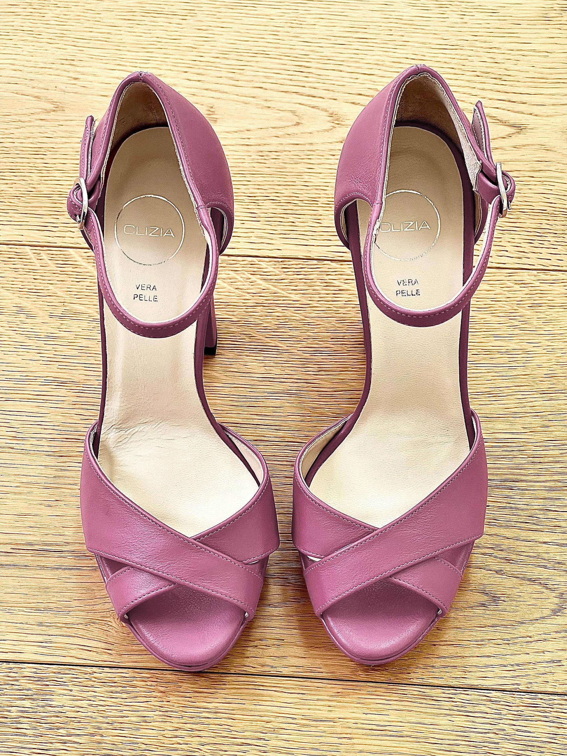 Sandalen mit gekreuzten Riemen und breitem Absatz.