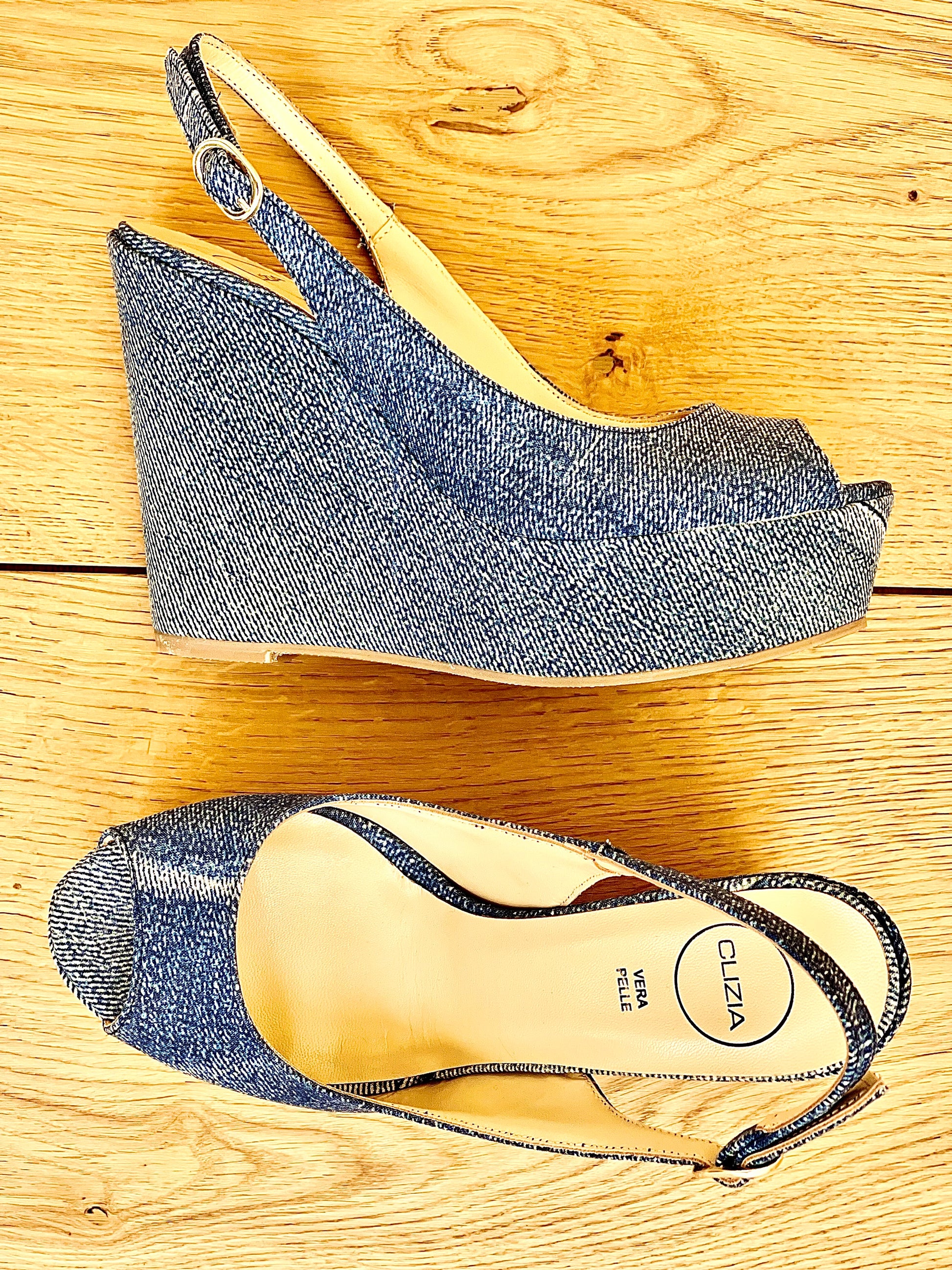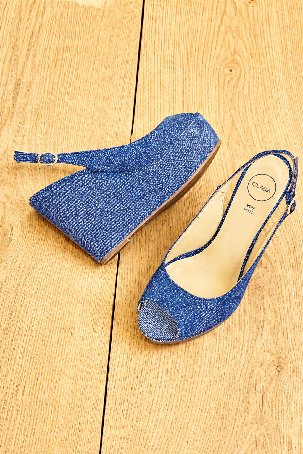 Zehenoffene Slingback-Pumps in Jeansblau auf hohem Keil.