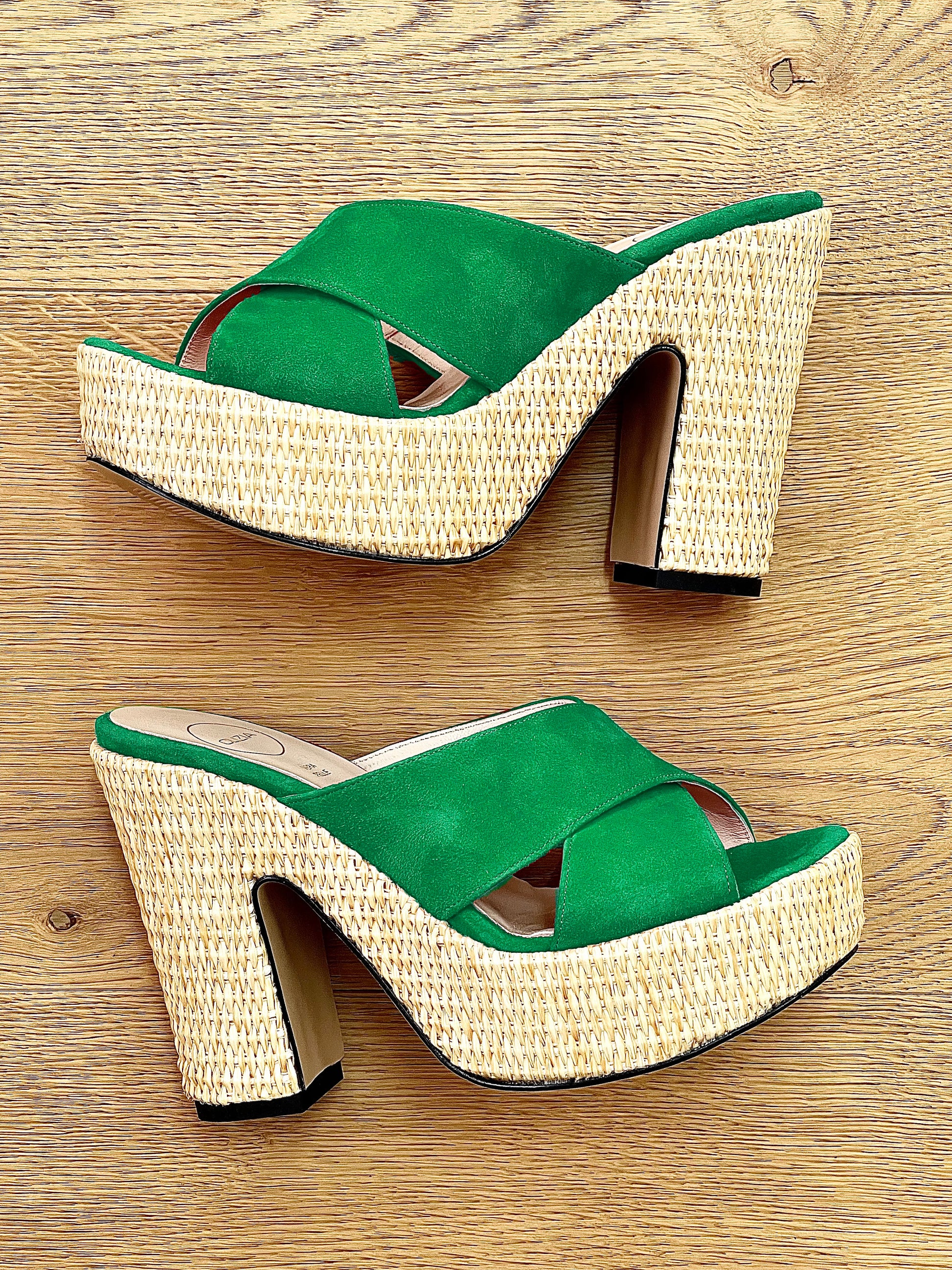 Hohe gekreuzte Sandalen mit Bastkeil.