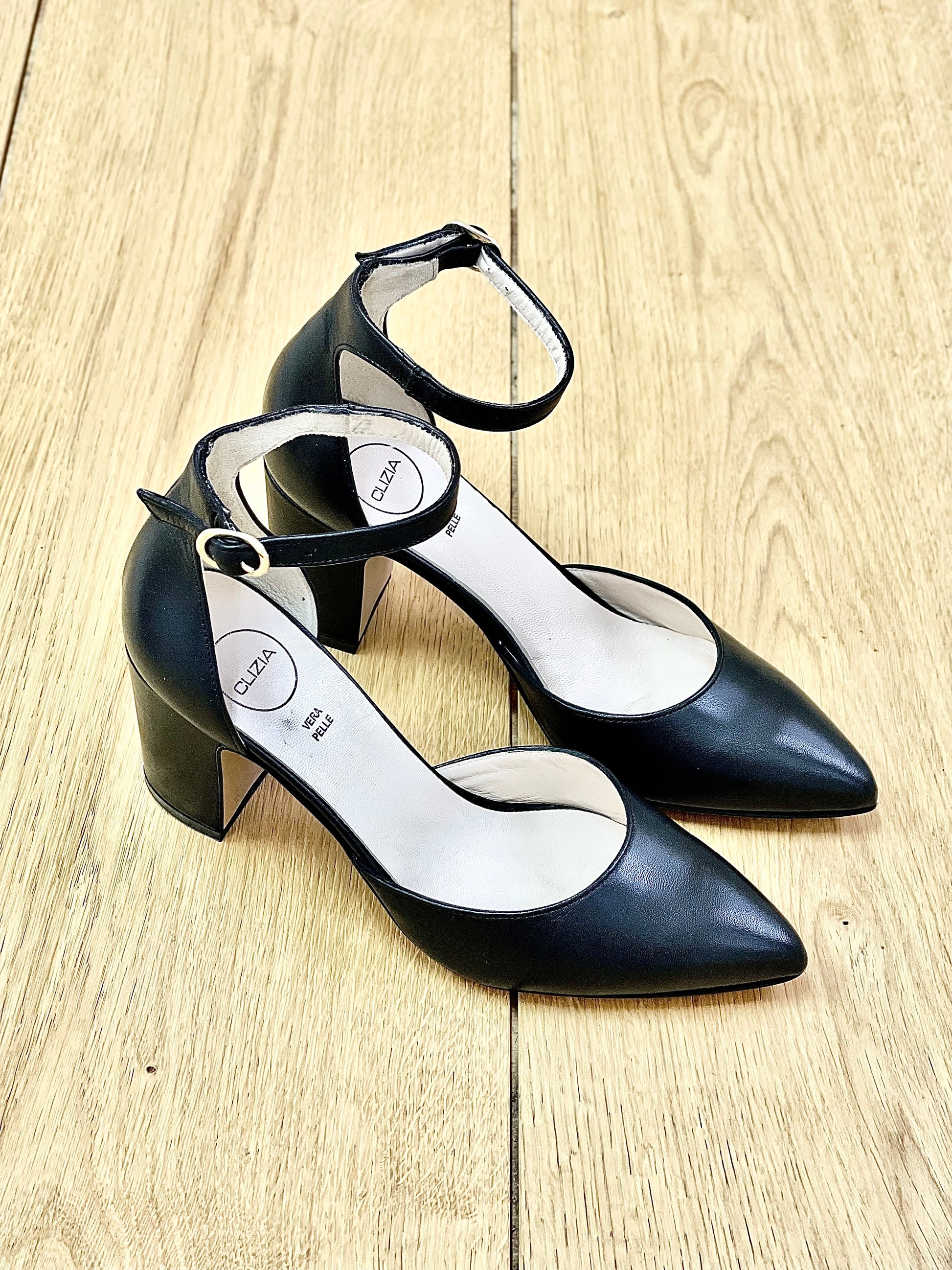 Pumps mit spitzer Spitze und Absatz aus Leder mit 75 mm breitem Absatz.