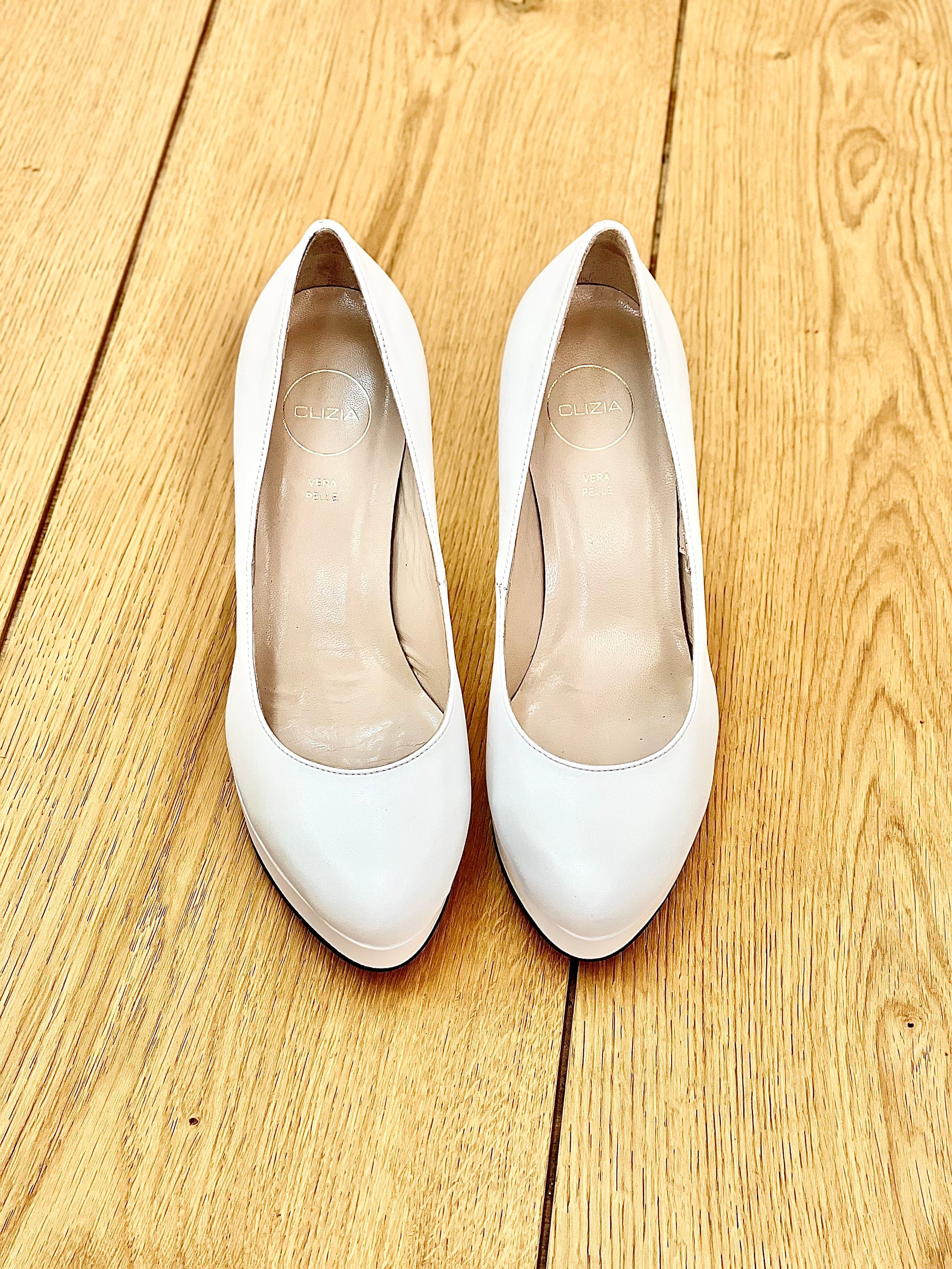 Pumps mit runder Spitze aus weißem Leder mit 12 cm hohem Stilettoabsatz und 2 cm Plateau.