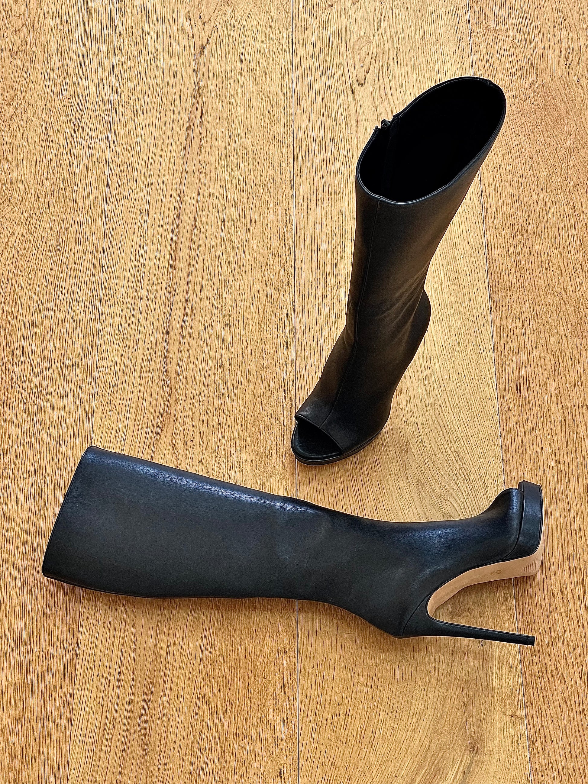 Hohe Stiefel mit Stiletto-Absatz und Plateau.