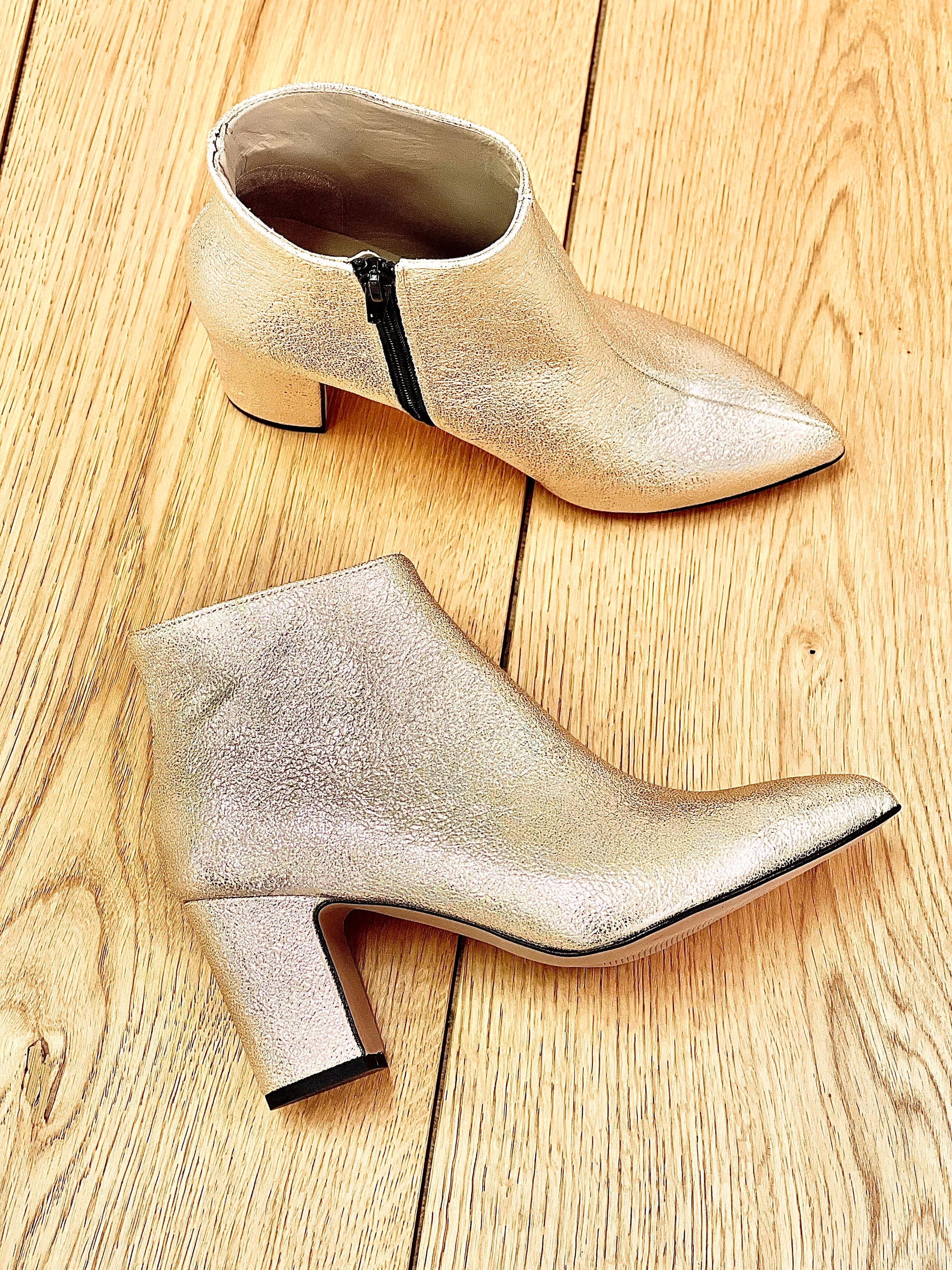 Spitz zulaufende Stiefelette mit breitem, laminiertem Absatz.
