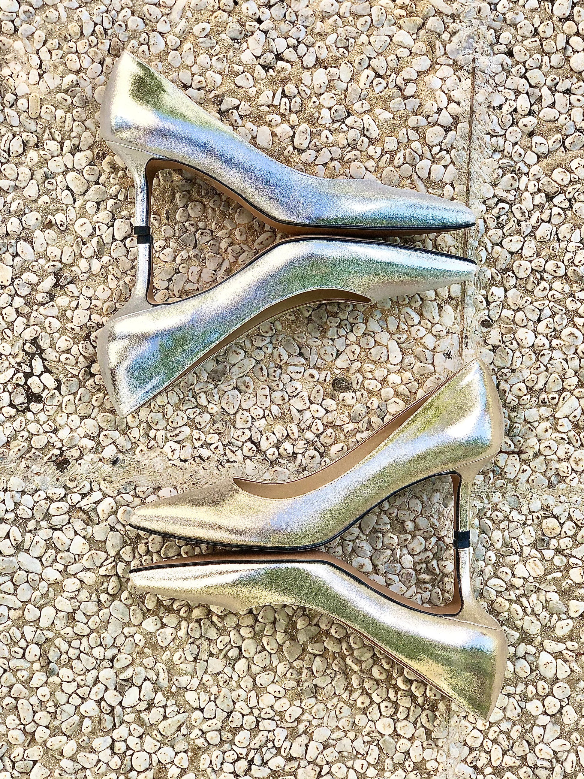 Spitz zulaufende Pumps aus Laminat mit 6 cm Absatz.