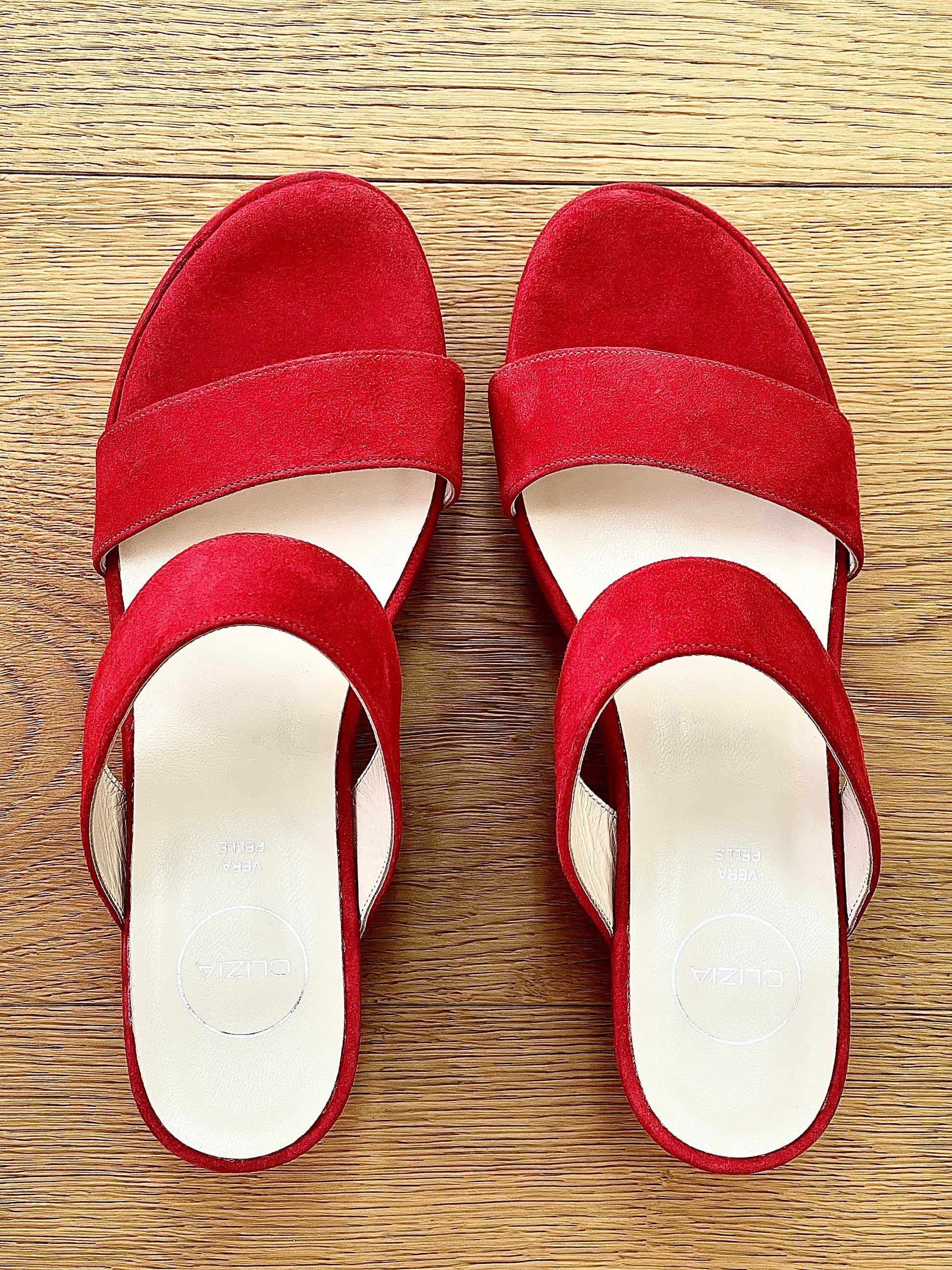 Mittlere Keilsandalen mit doppeltem Riemen.