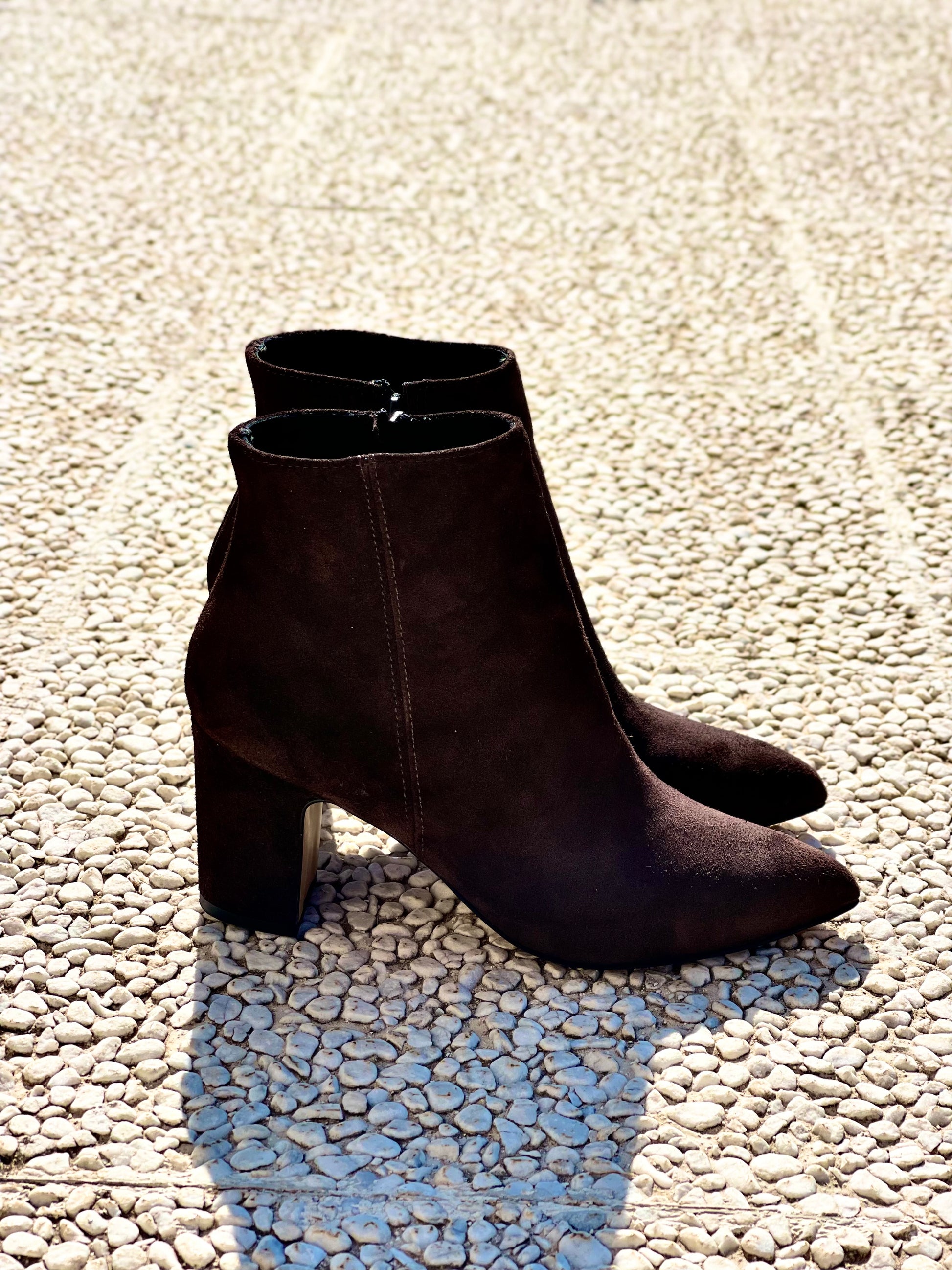 Spitz zulaufende Wildlederstiefelette mit 75 mm Absatz.