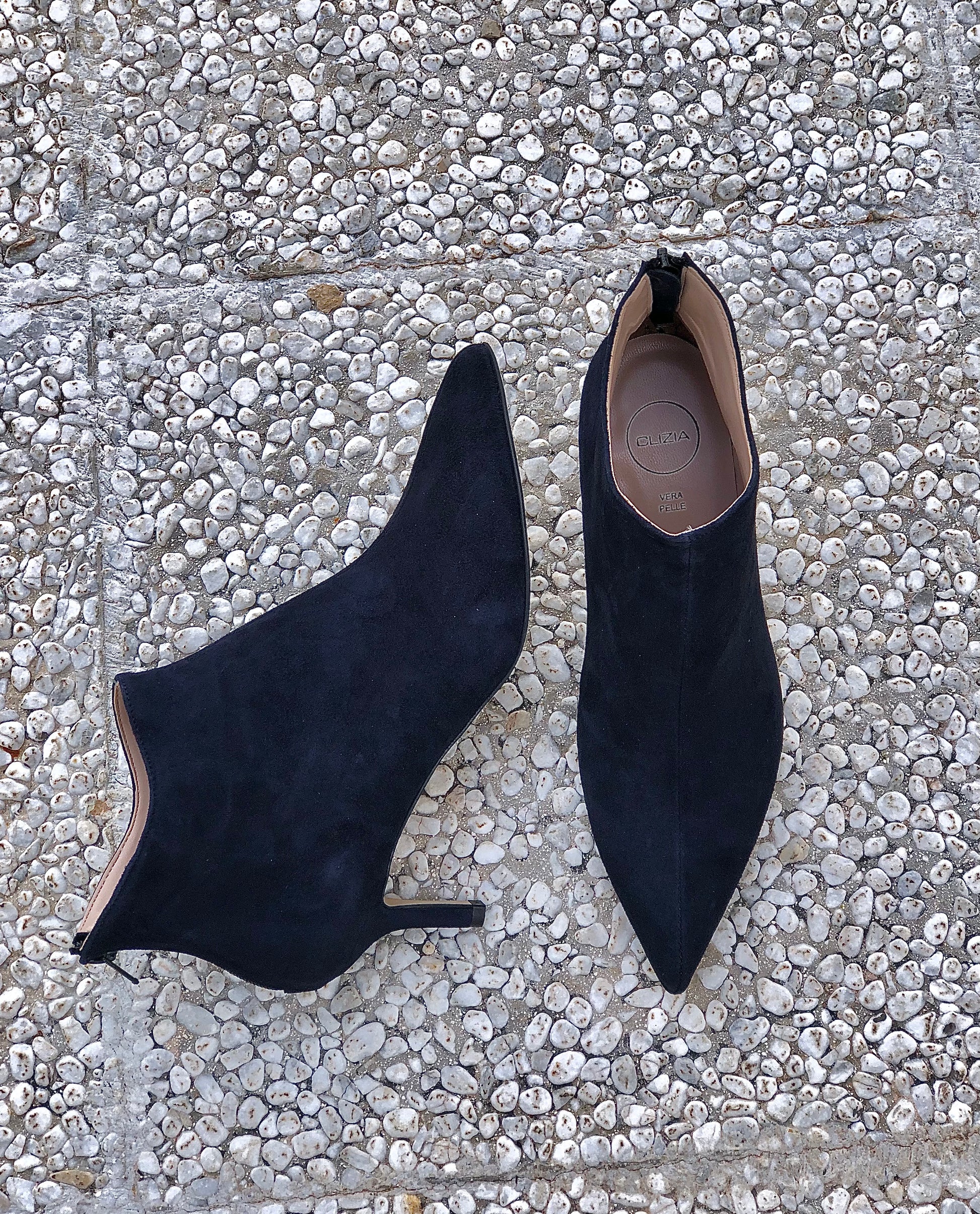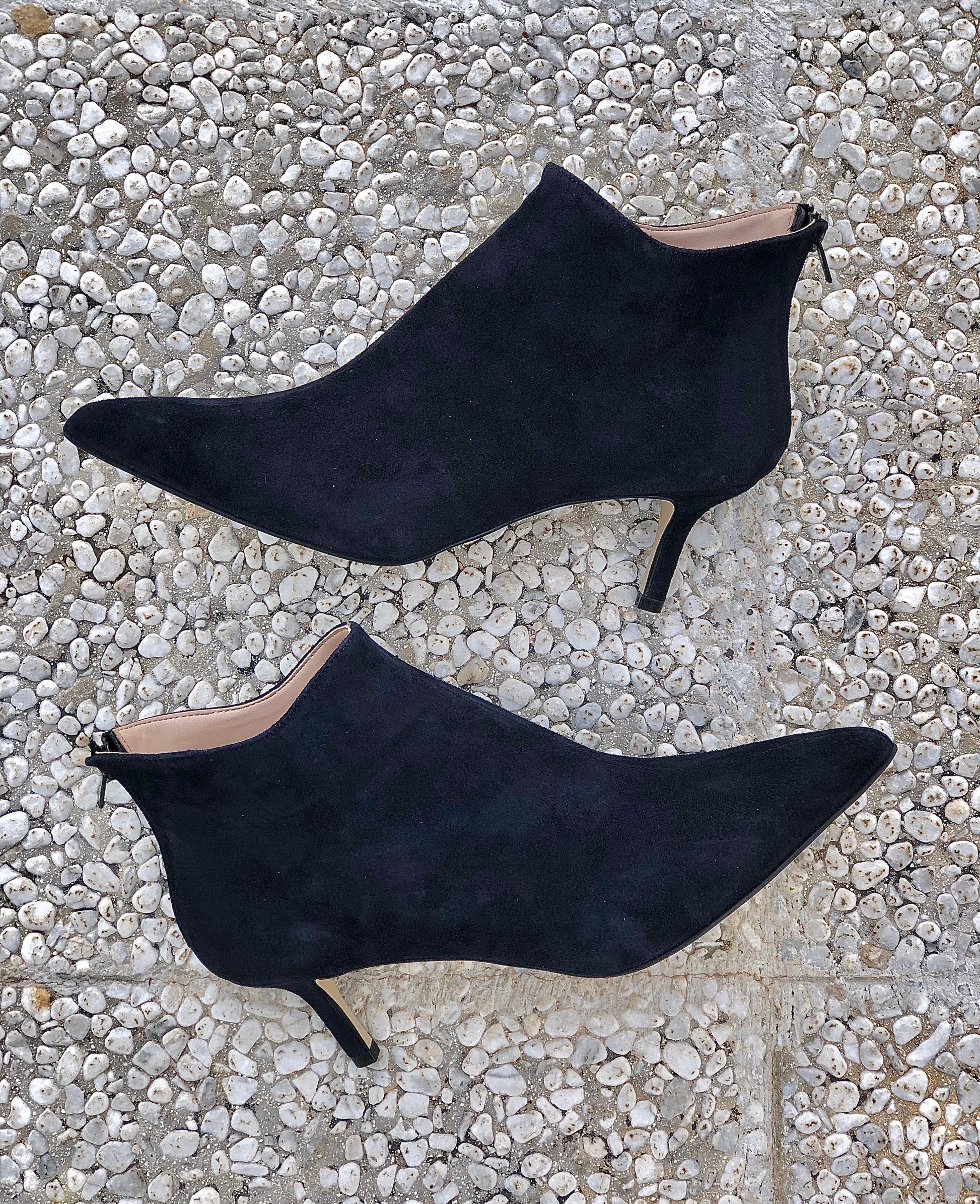 STIEFELETTE AUS WILDLEDER MIT 6 CM ABSATZ UND SPITZER ZEHE. MIT RÜCKENREISSVERSCHLUSS.