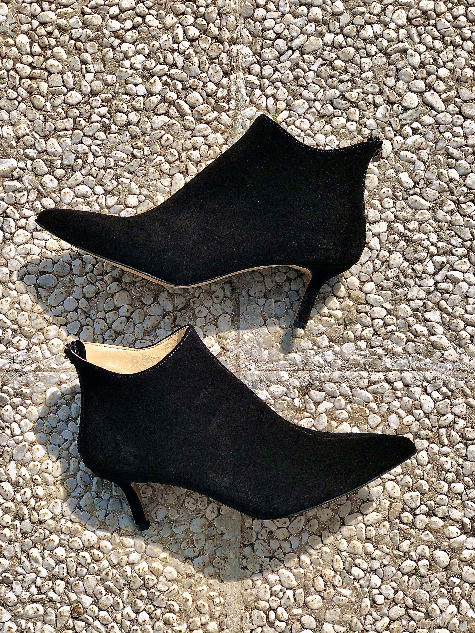 STIEFELETTE AUS WILDLEDER MIT 6 CM ABSATZ UND SPITZER ZEHE. MIT RÜCKENREISSVERSCHLUSS.