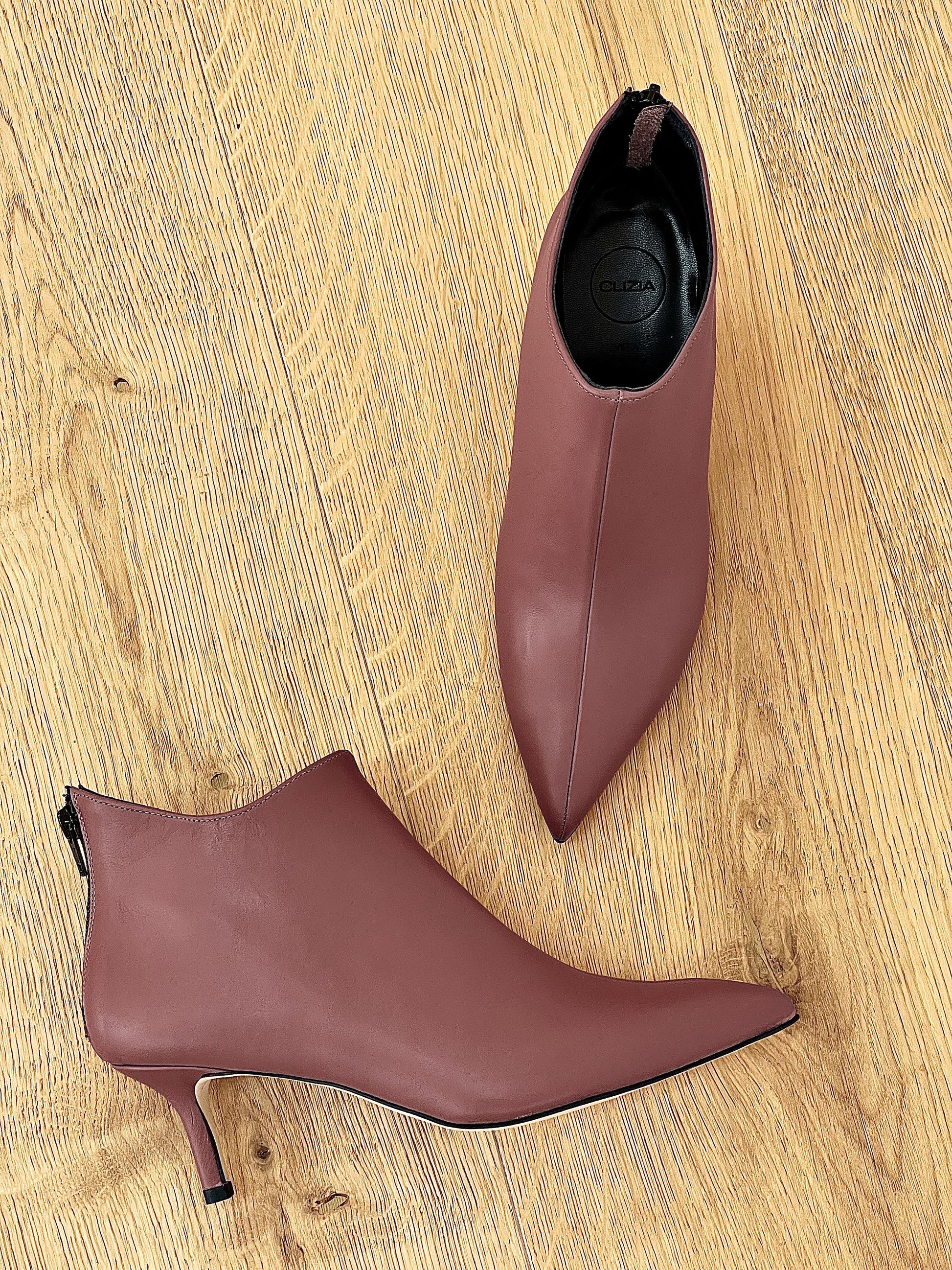 Spitz zulaufende Lederstiefelette mit Reißverschluss hinten und 6 cm Absatz.