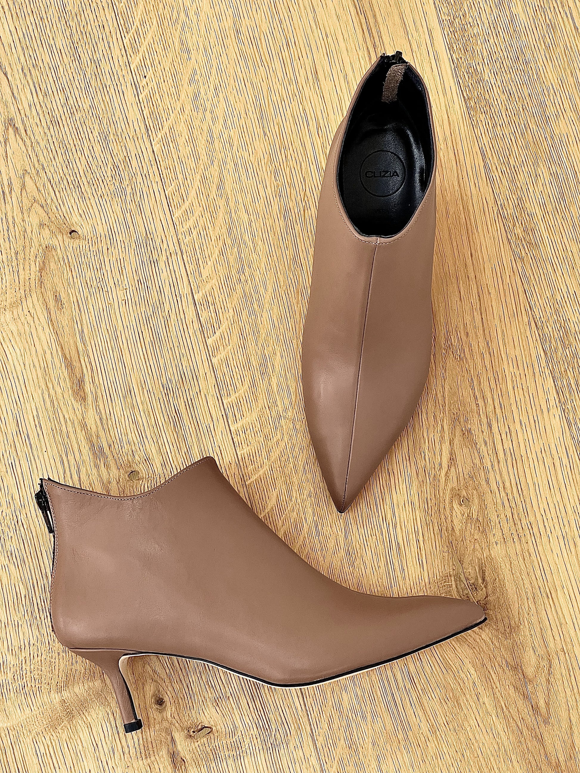 Spitz zulaufende Lederstiefelette mit Reißverschluss hinten und 6 cm Absatz.