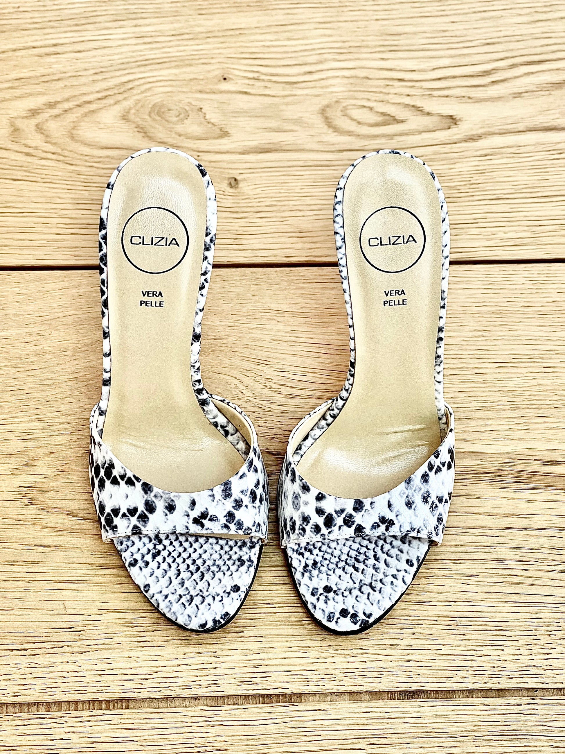 Hohe Pantoletten-Sandalen, Tierpantoffel, 10cm Absatz.