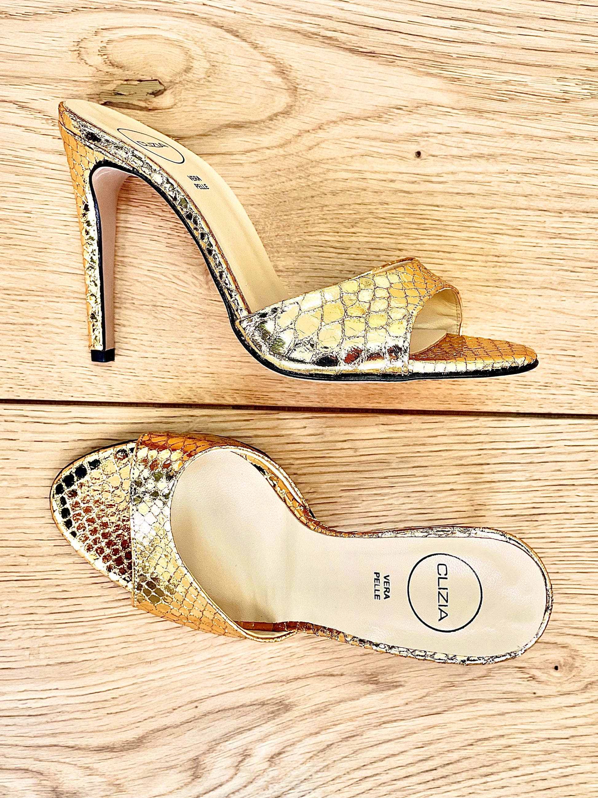 Hohe Pantoletten-Sandalen aus goldenem Laminat mit 10 cm Pfennigabsatz.