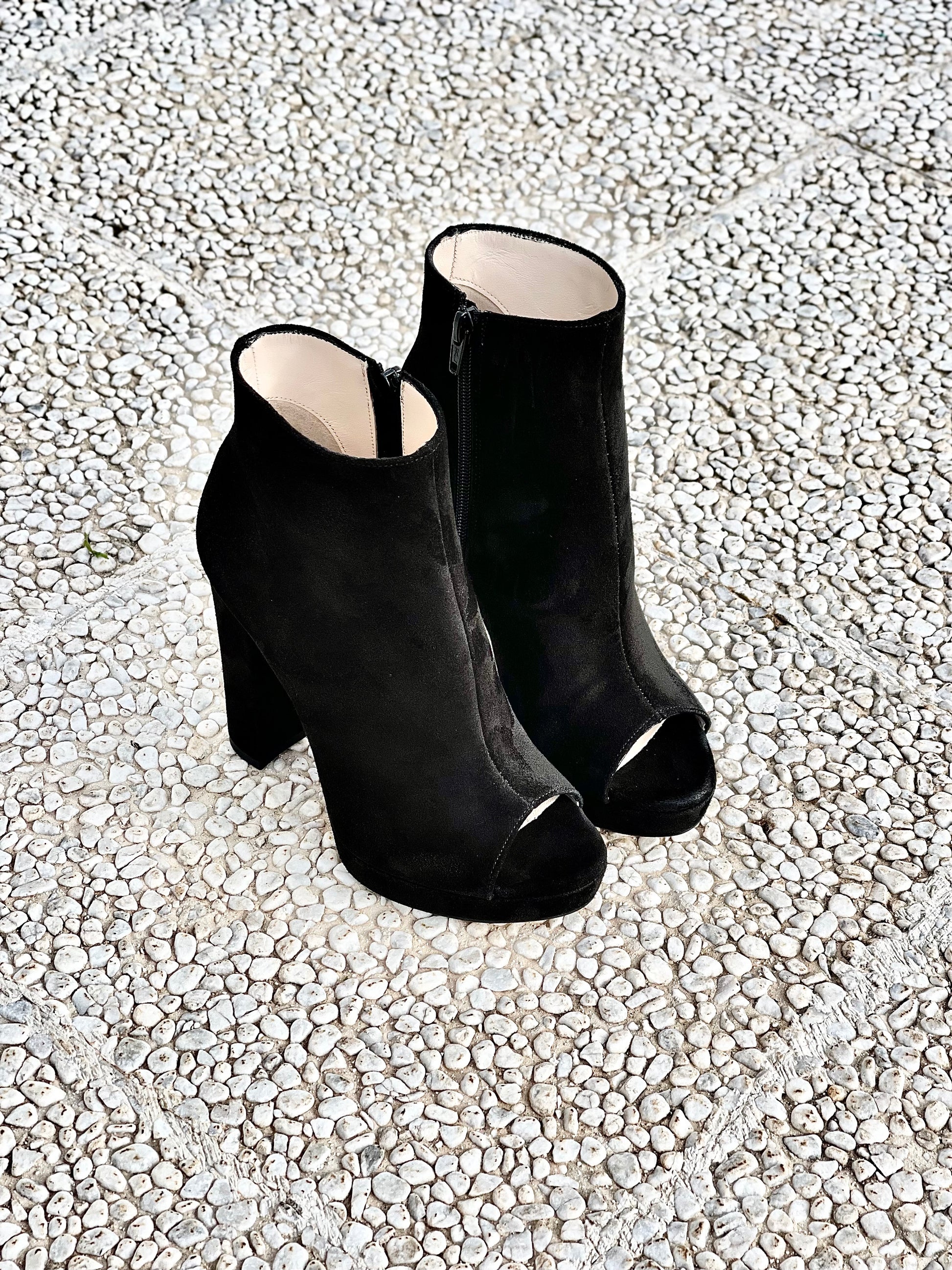Wildlederstiefelette mit 12cm Absatz und 2cm Plateau.