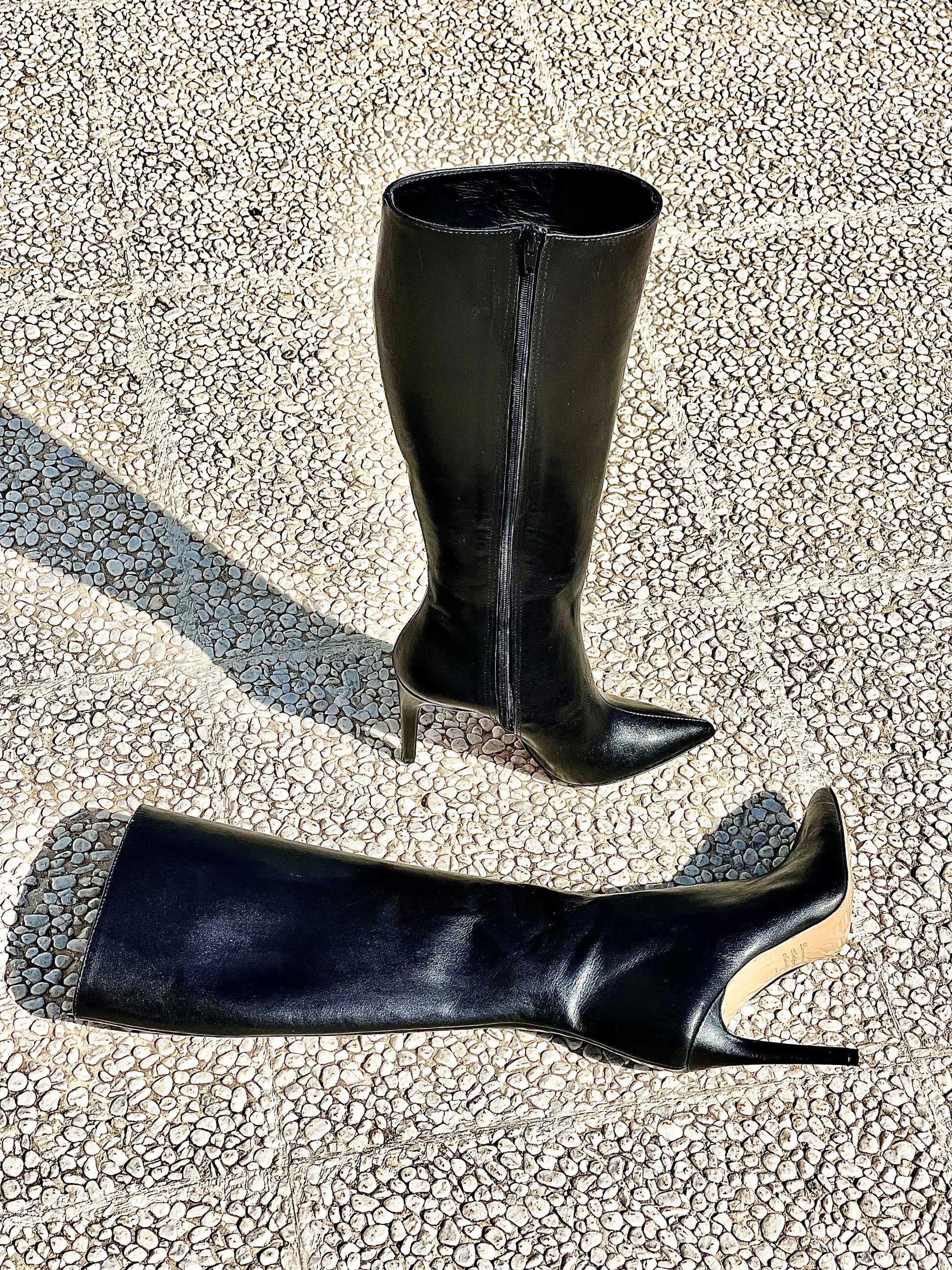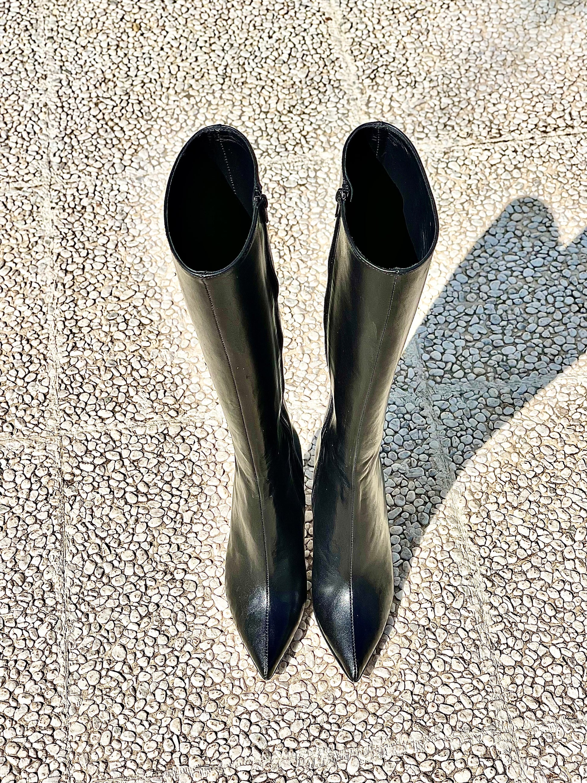 Spitz zulaufende Lederstiefel mit 10 cm hohem Pfennigabsatz.