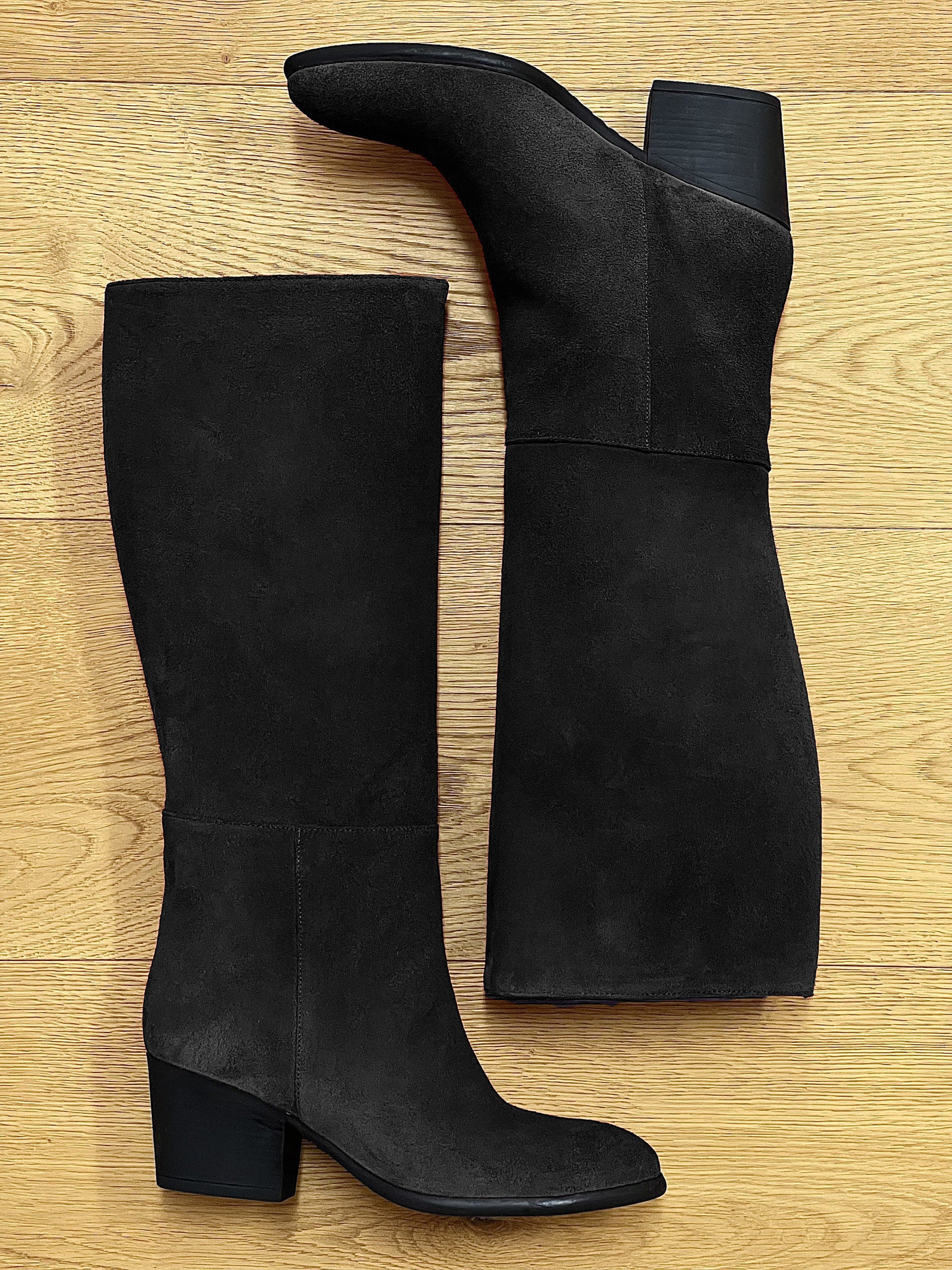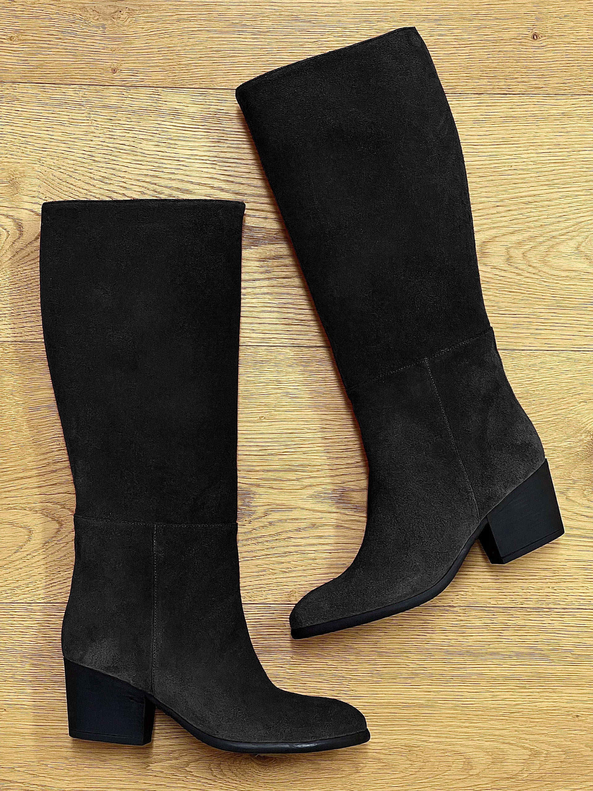 Röhrenförmige Stiefel mit runder Zehe.
