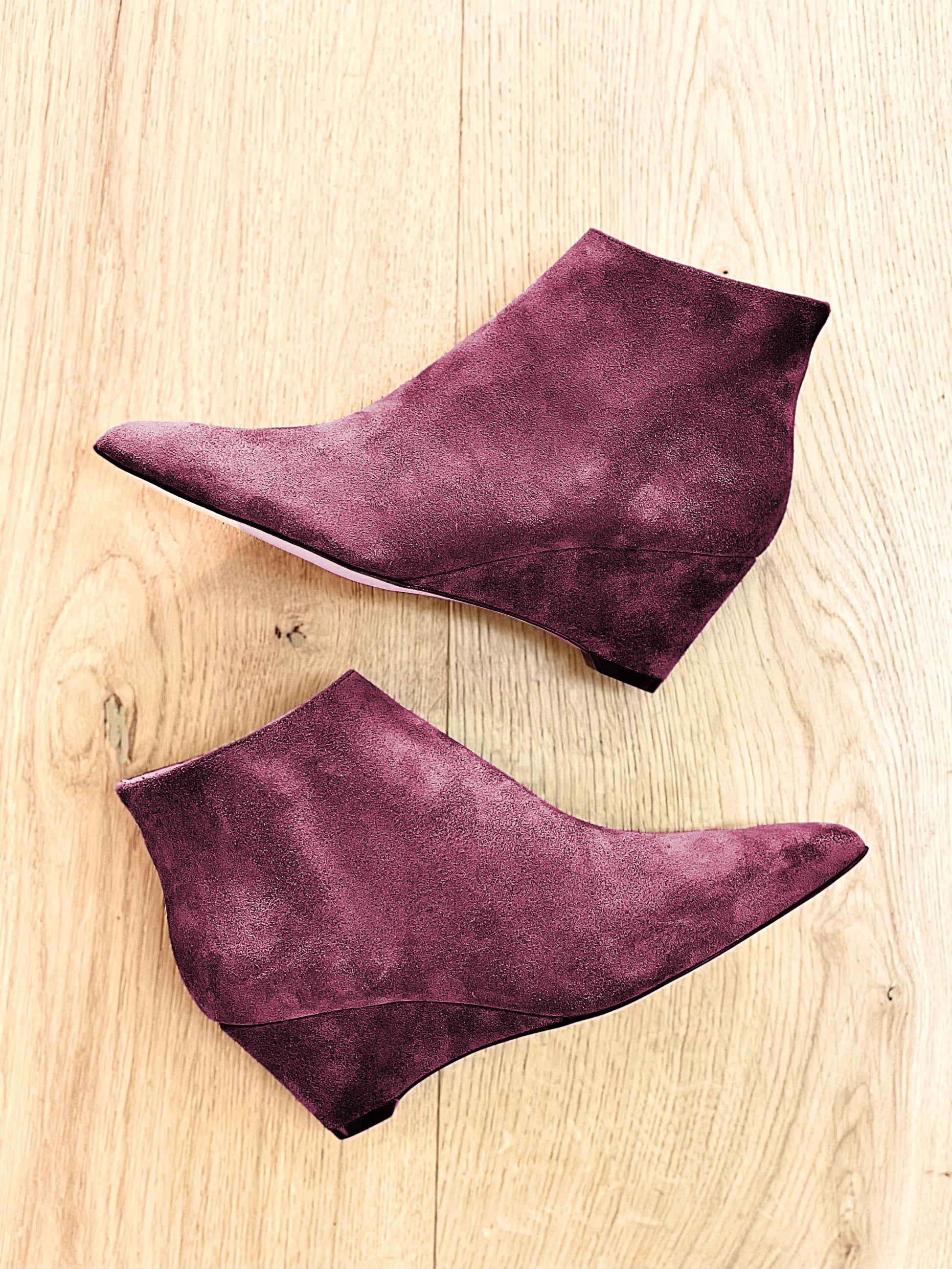 Stiefelette aus Wildleder mit einem 6 cm hohen Keil hinten.