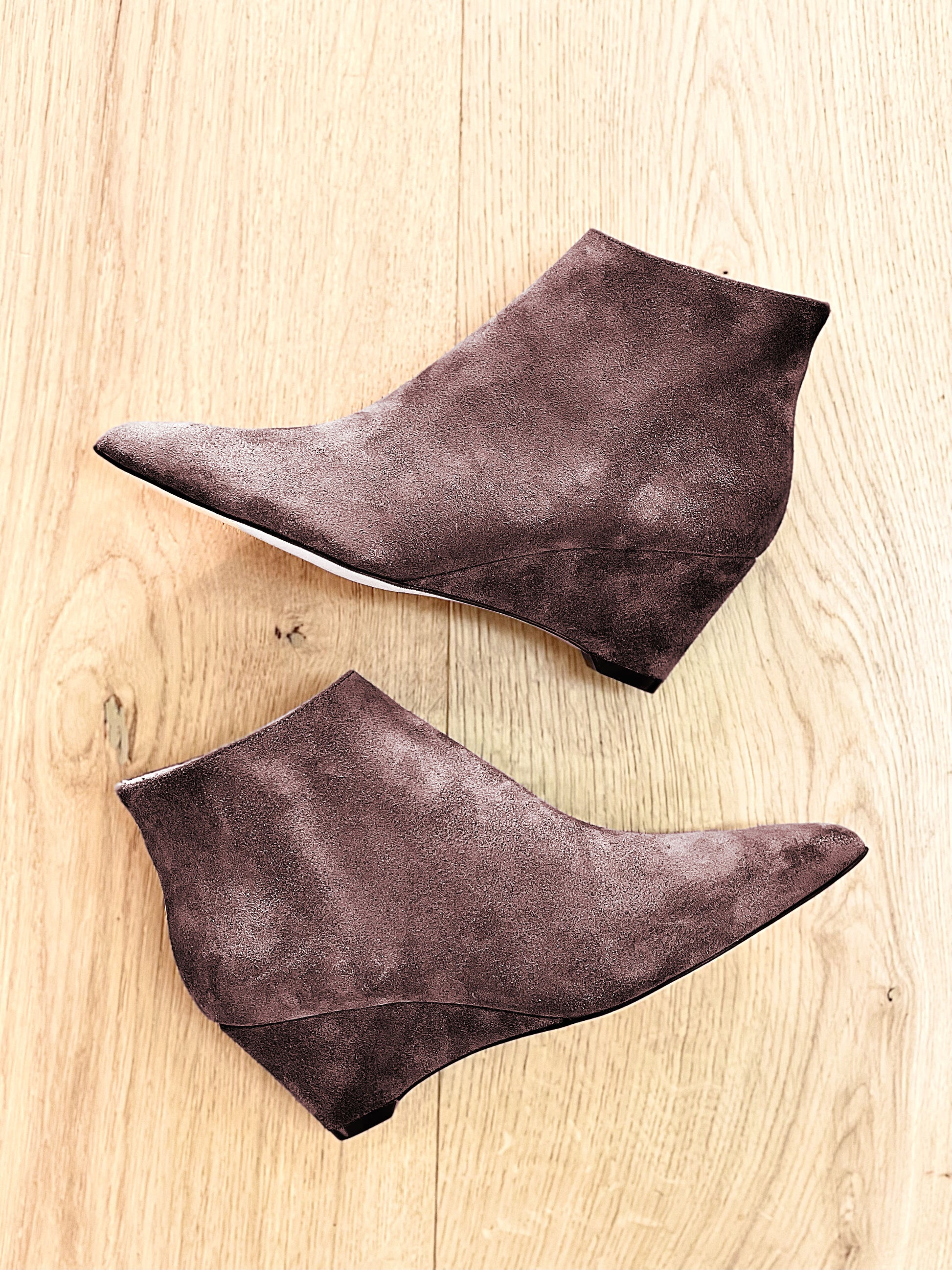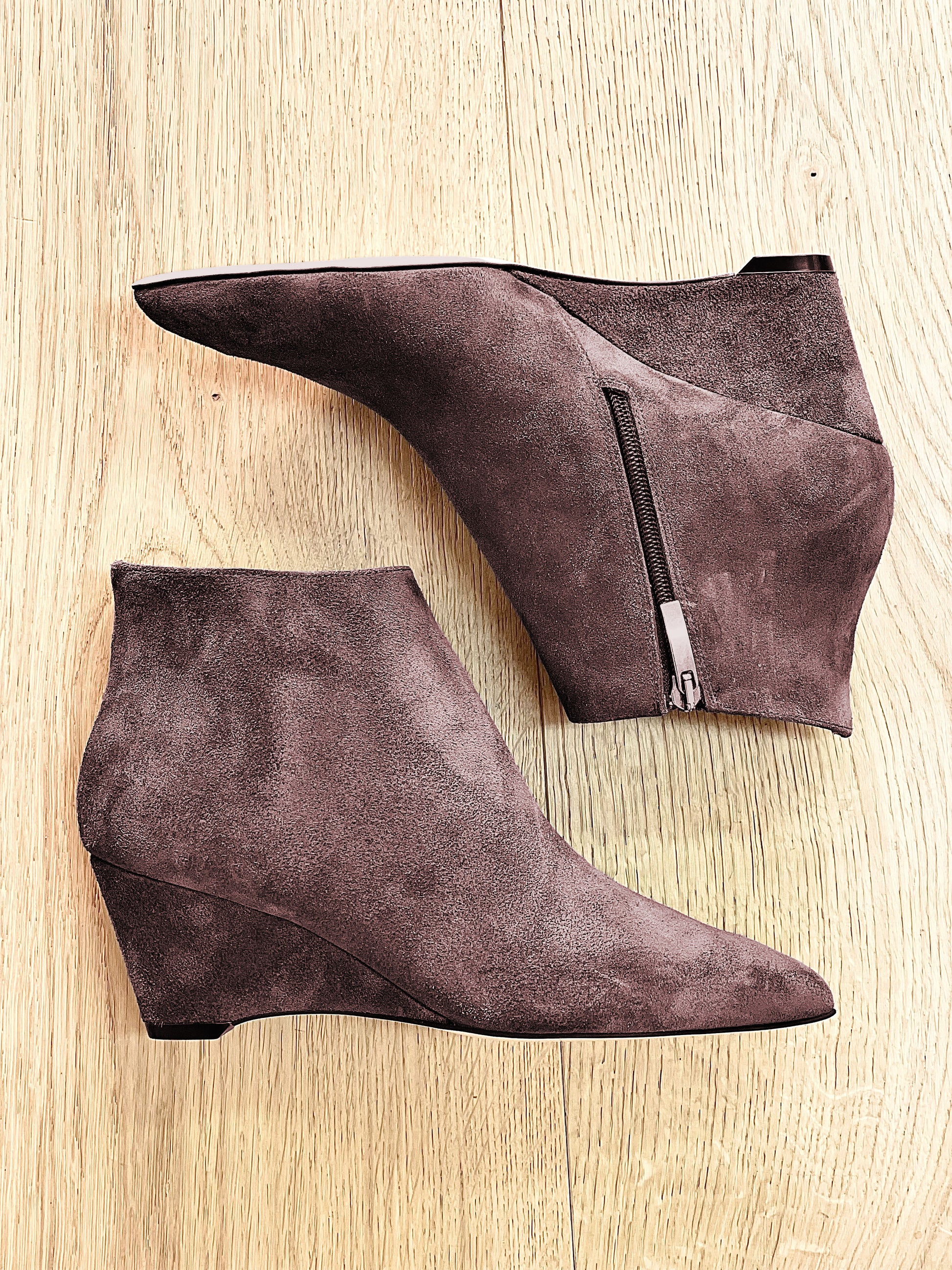 Stiefelette aus Wildleder mit einem 6 cm hohen Keil hinten.