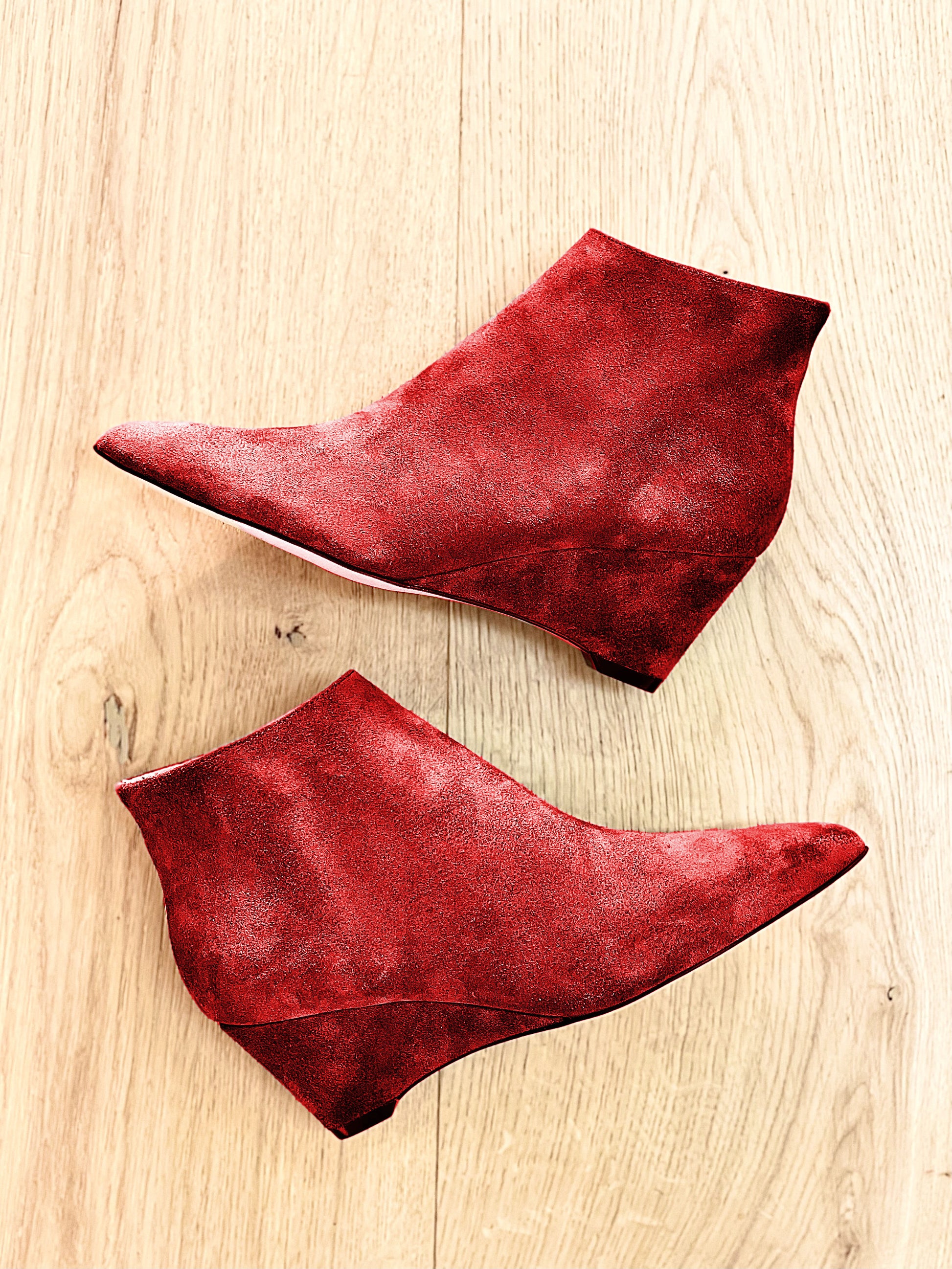 Stiefelette aus Wildleder mit einem 6 cm hohen Keil hinten.