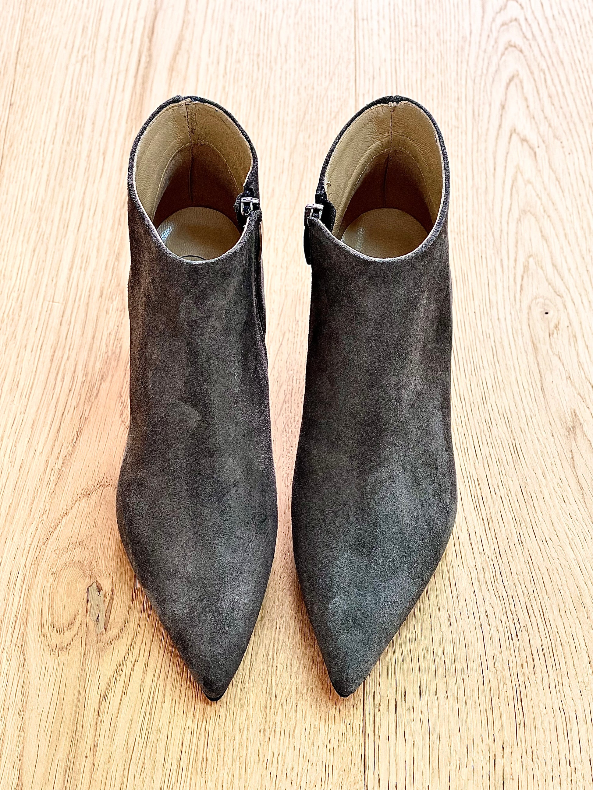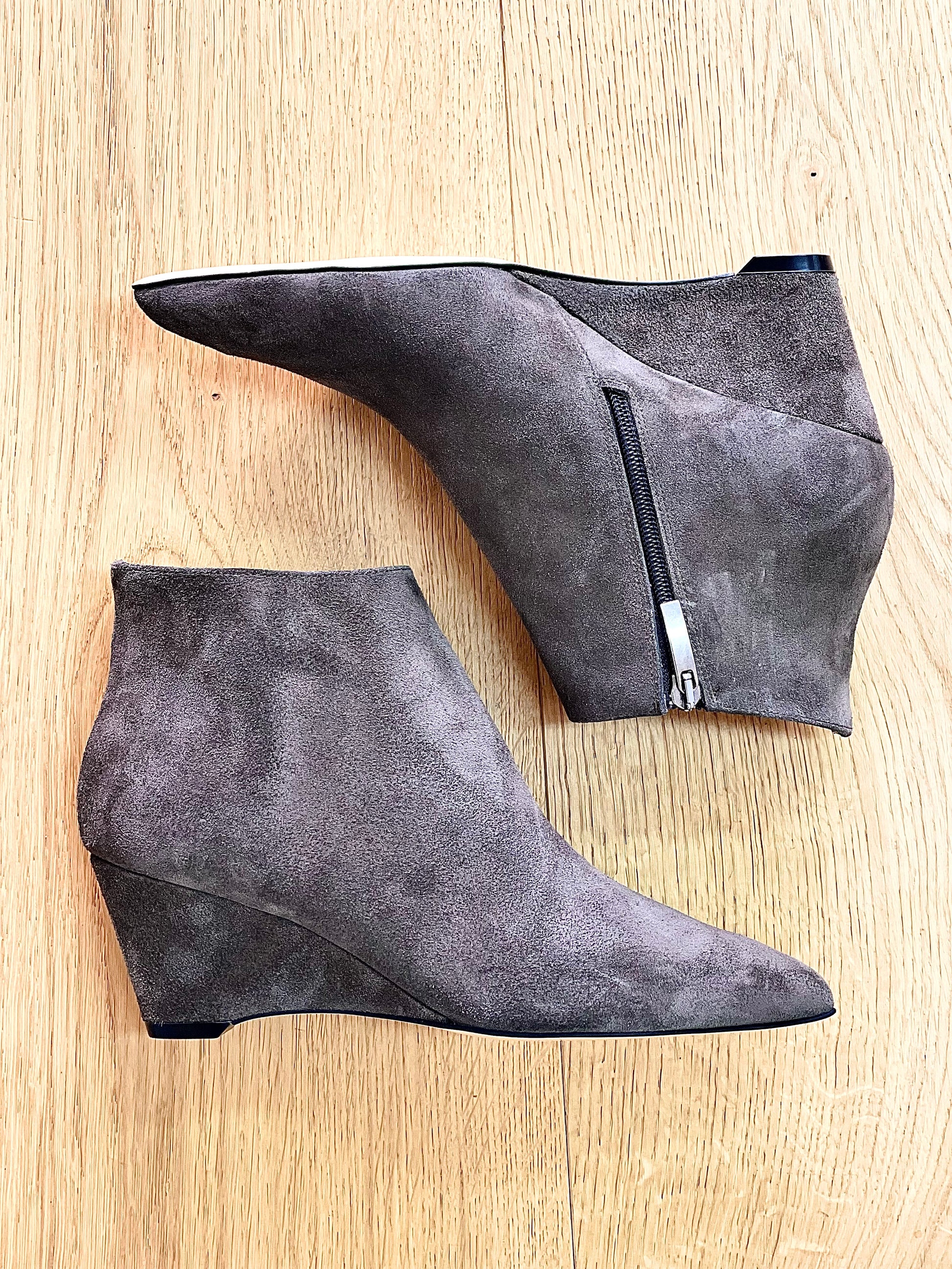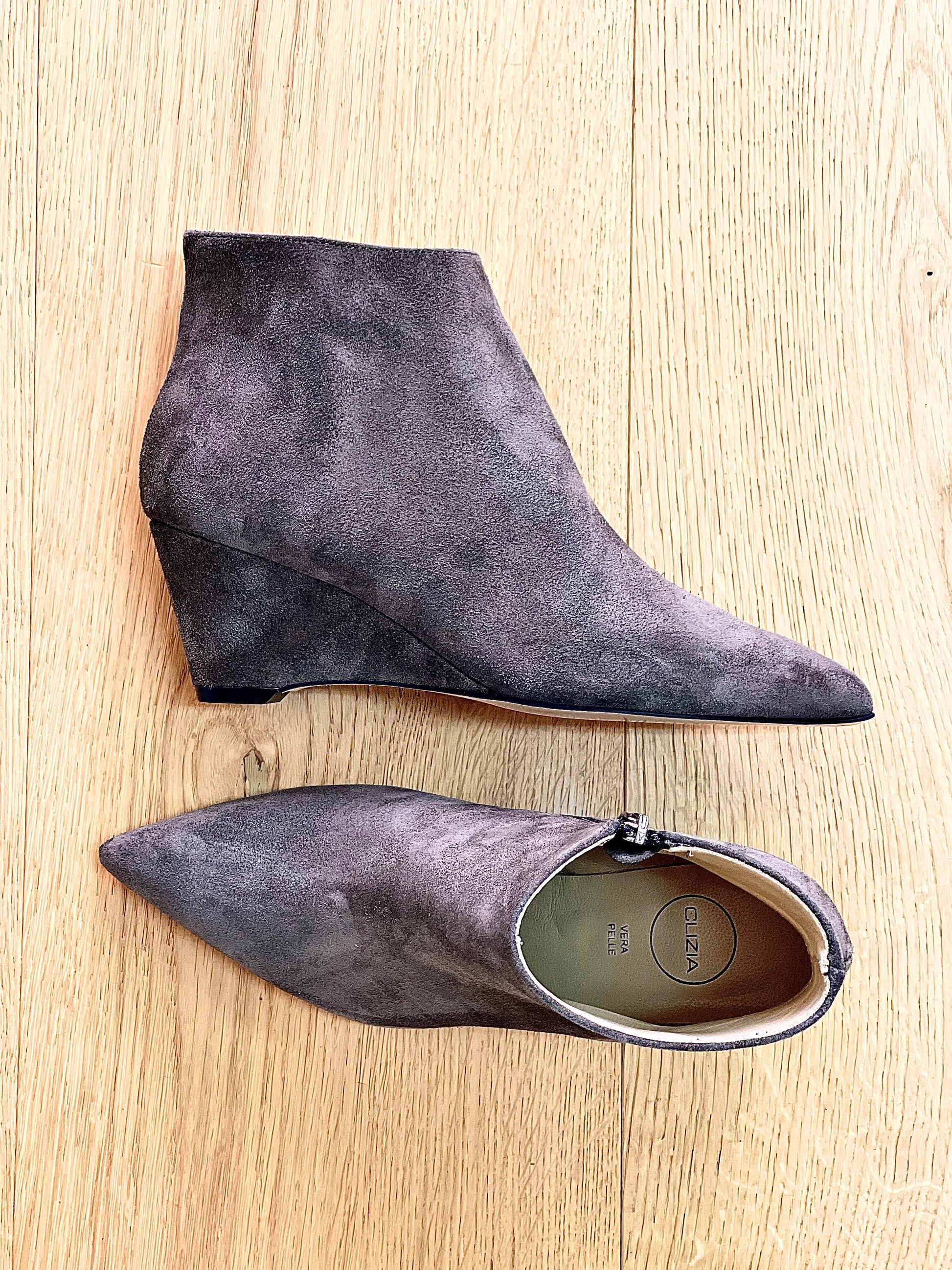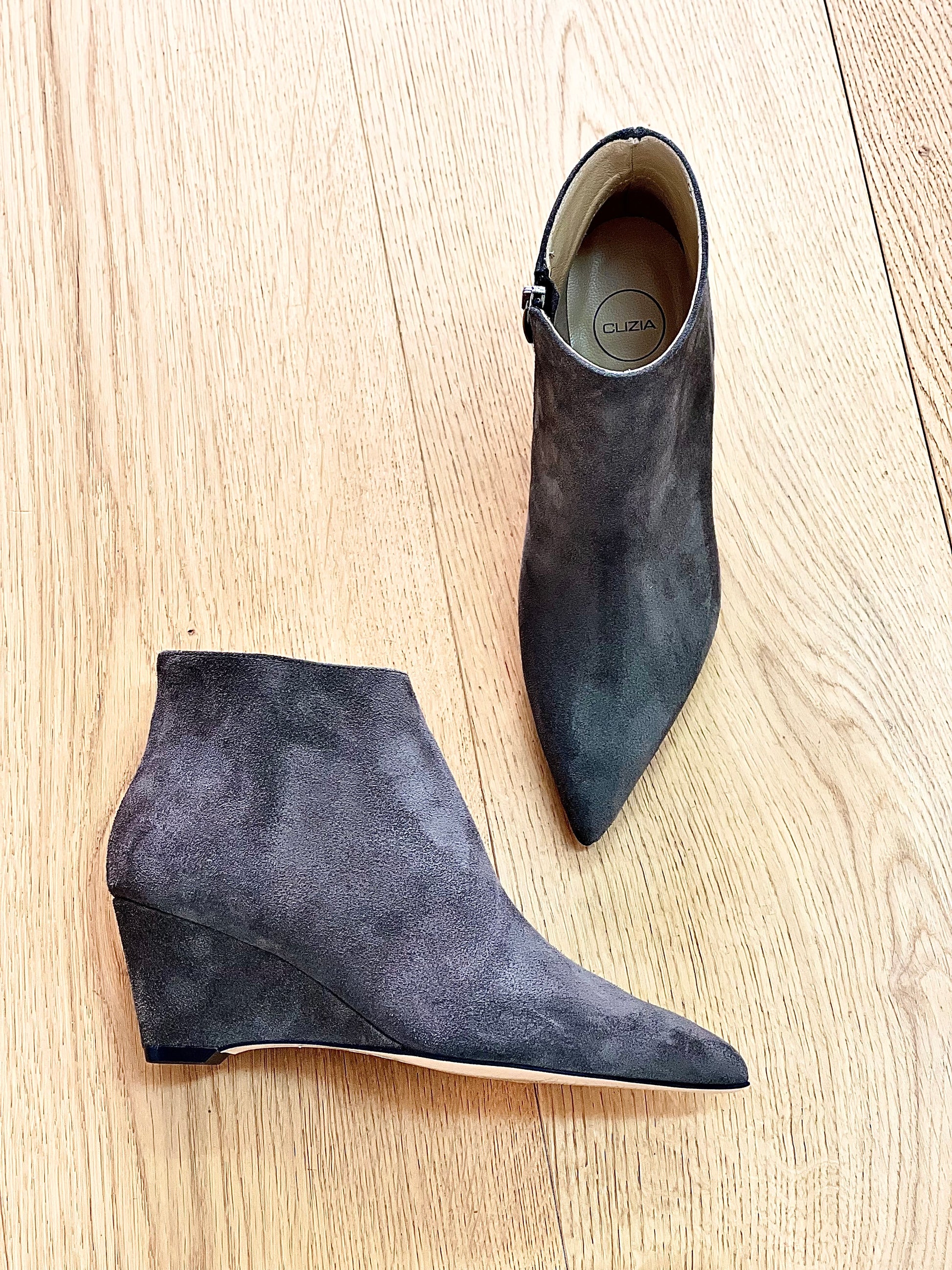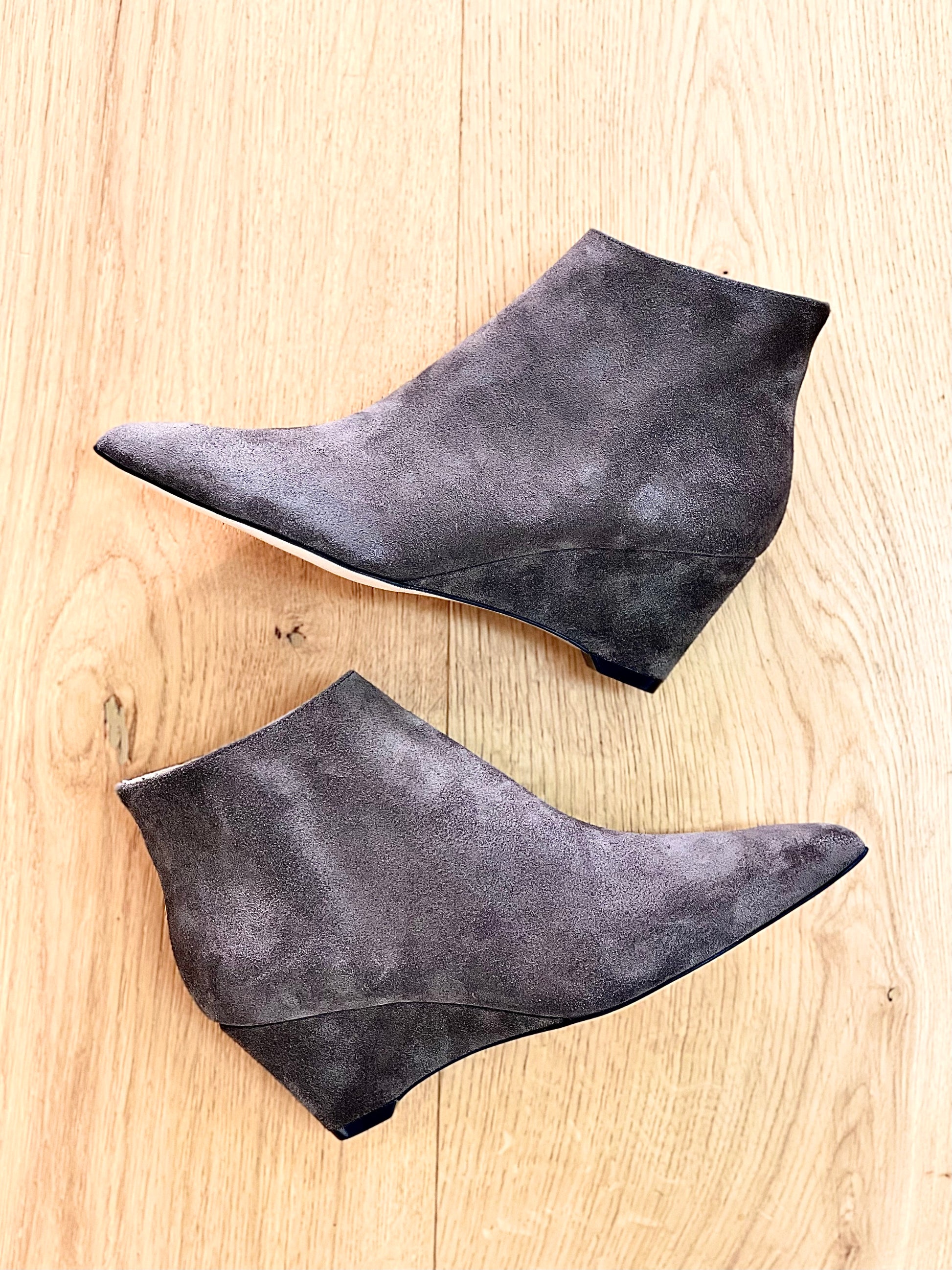 Stiefelette aus Wildleder mit einem 6 cm hohen Keil hinten.