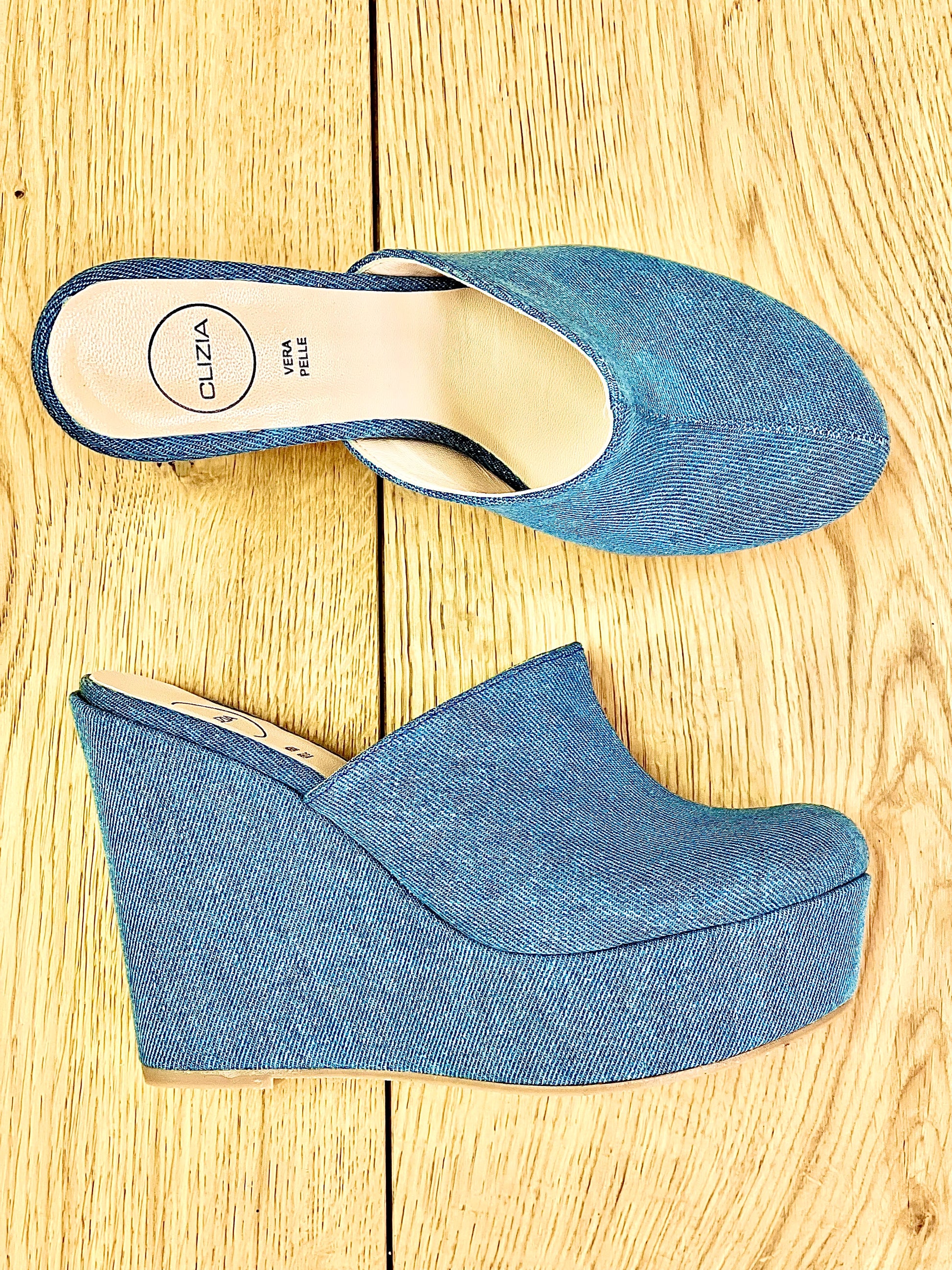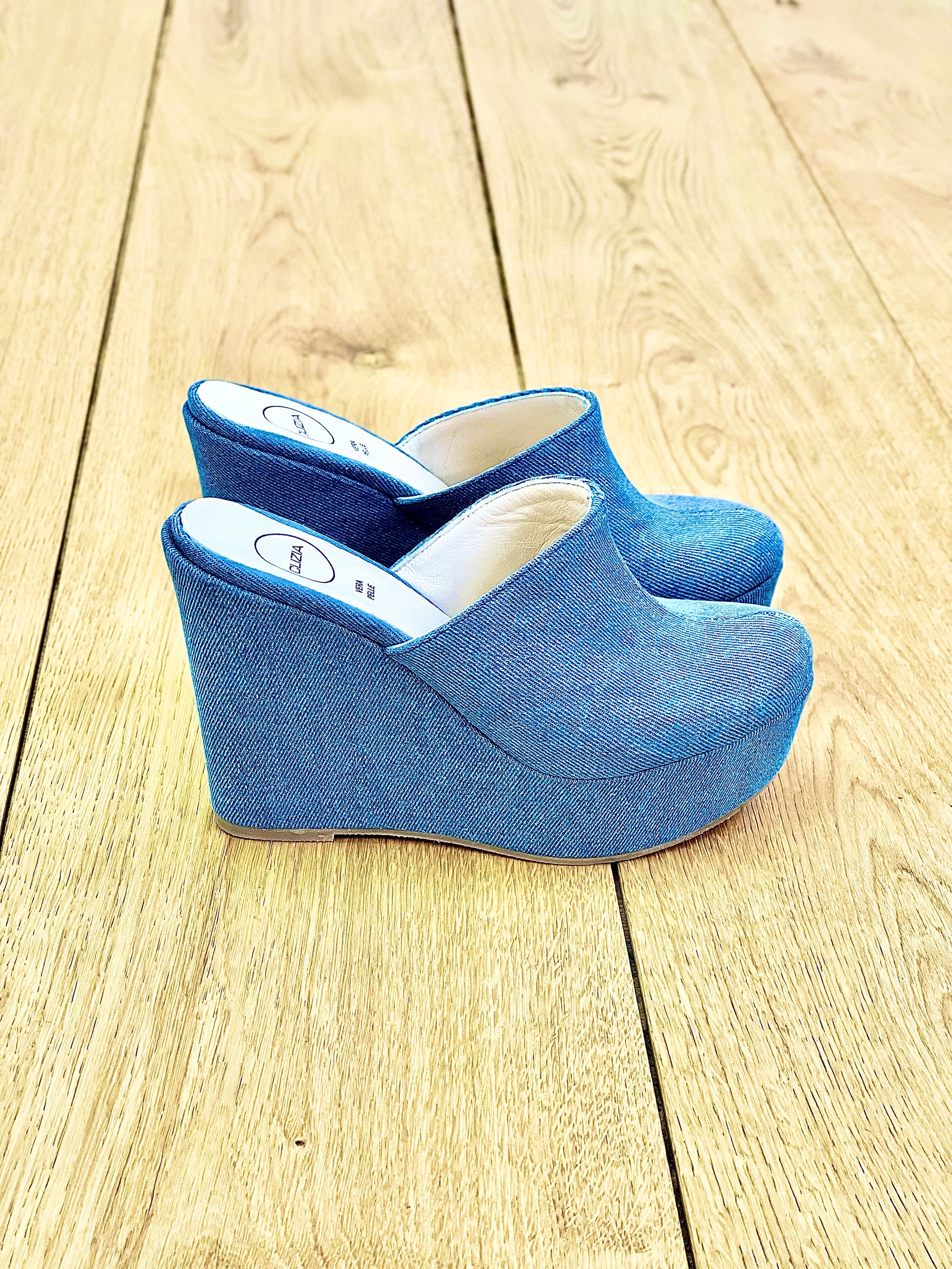 Runder Zehensabot aus Denim auf 115 mm hohem Keil.