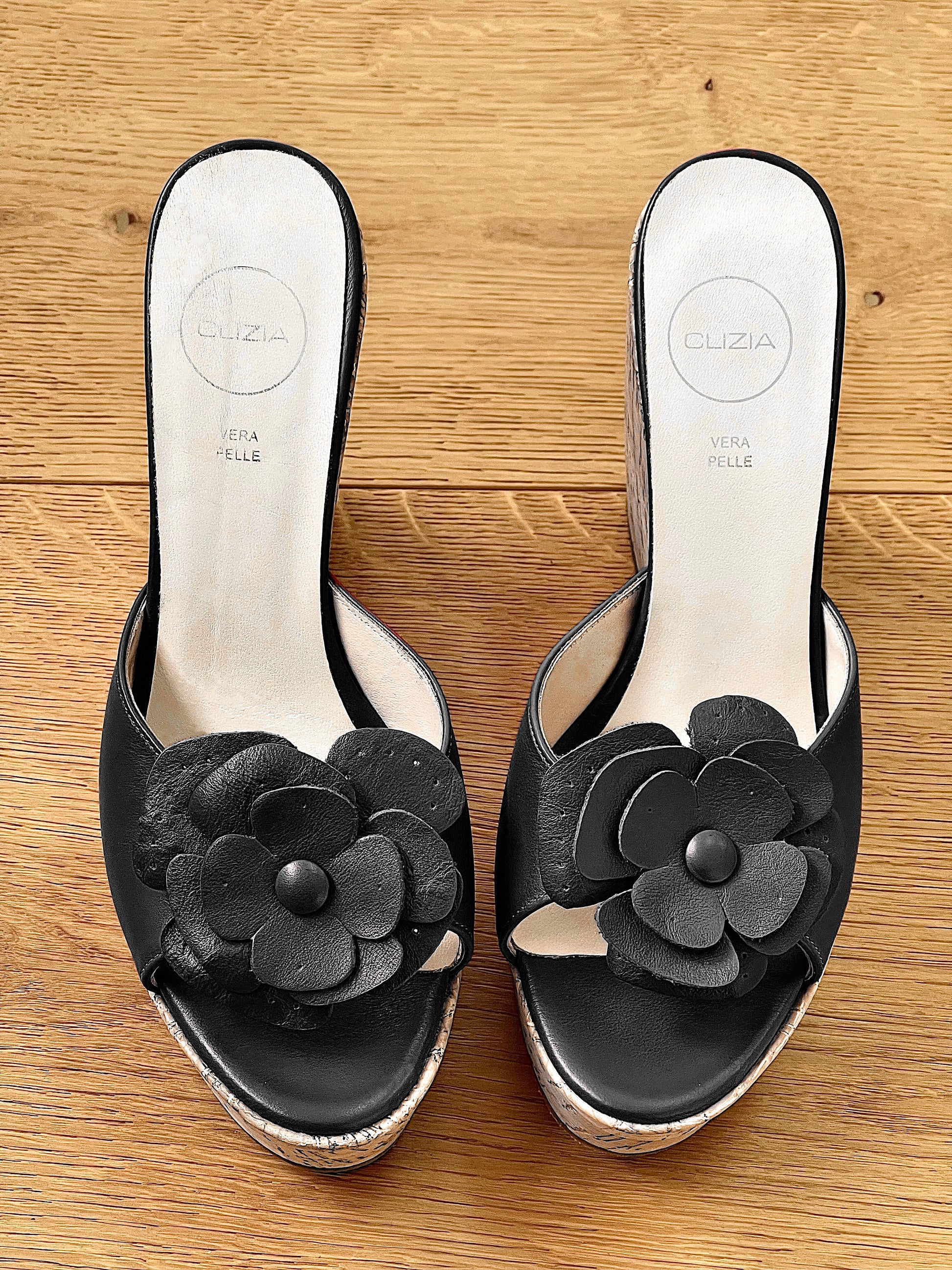 Hohe Pantoletten Sandalen Blumenausschnitt.