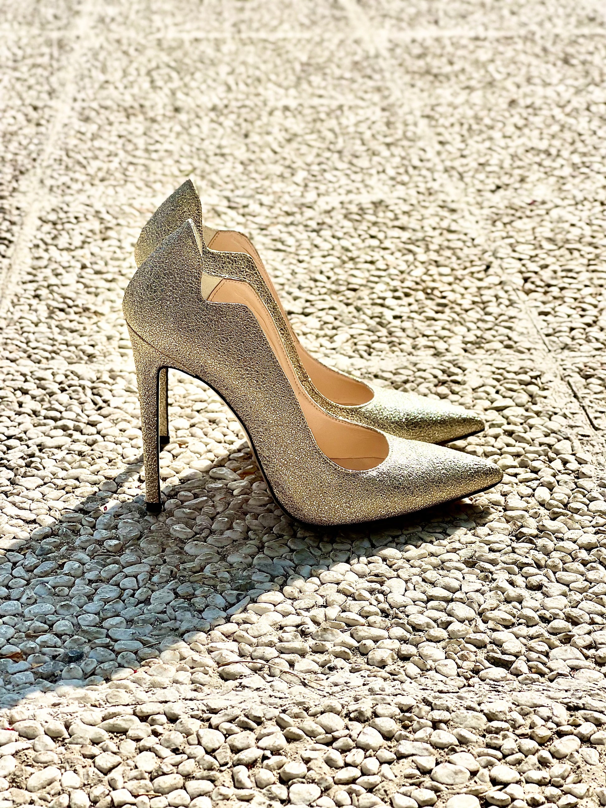 Spitz zulaufende Pumps aus Laminat mit Stilettoabsatz.
