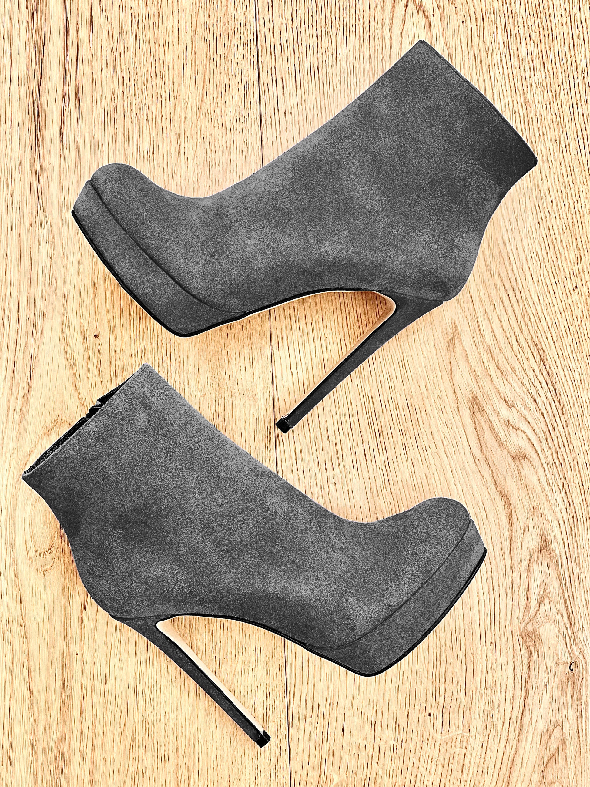 Hohe Wildlederstiefel mit runder Spitze, Plateau und Stilettoabsatz.