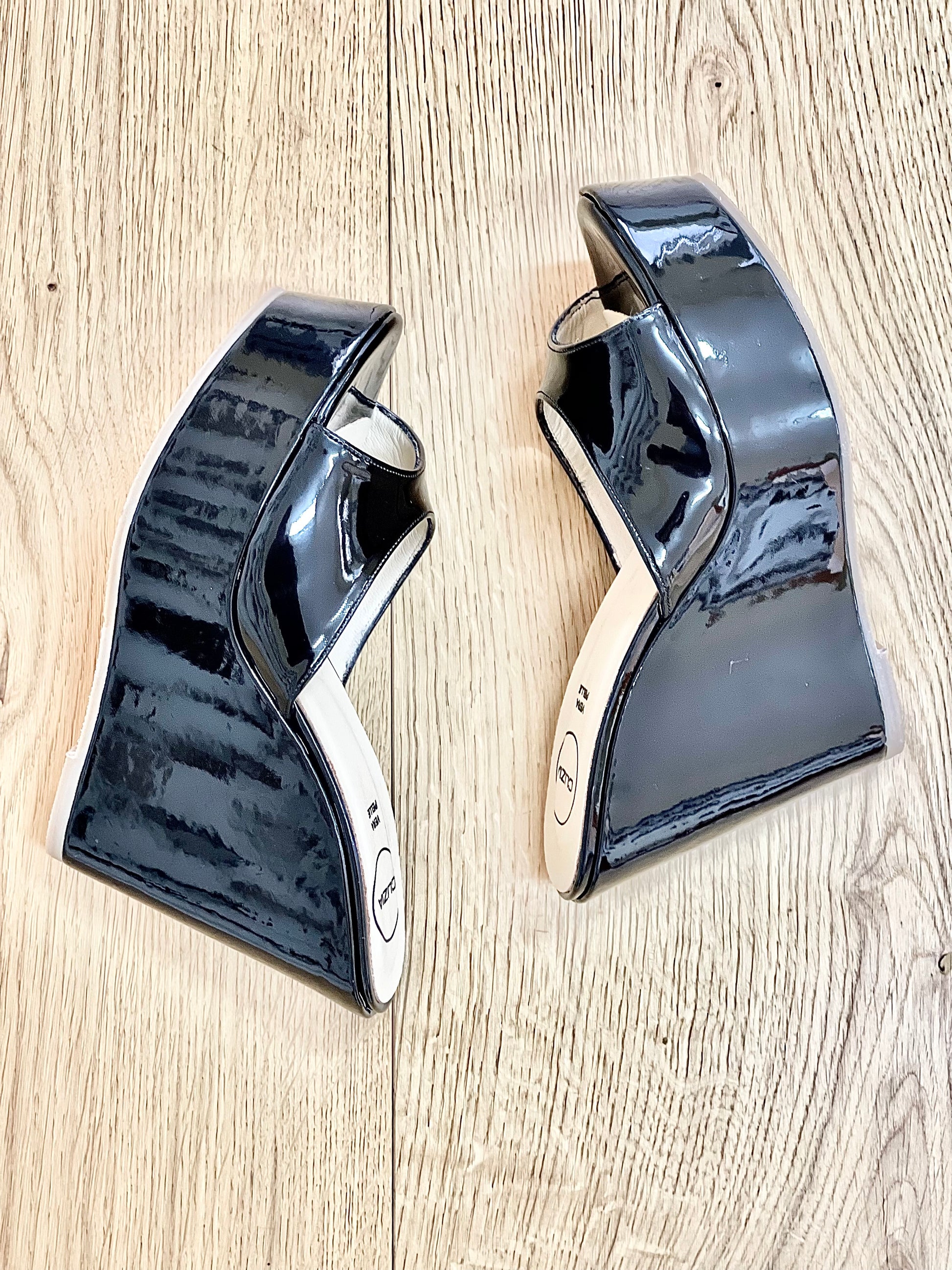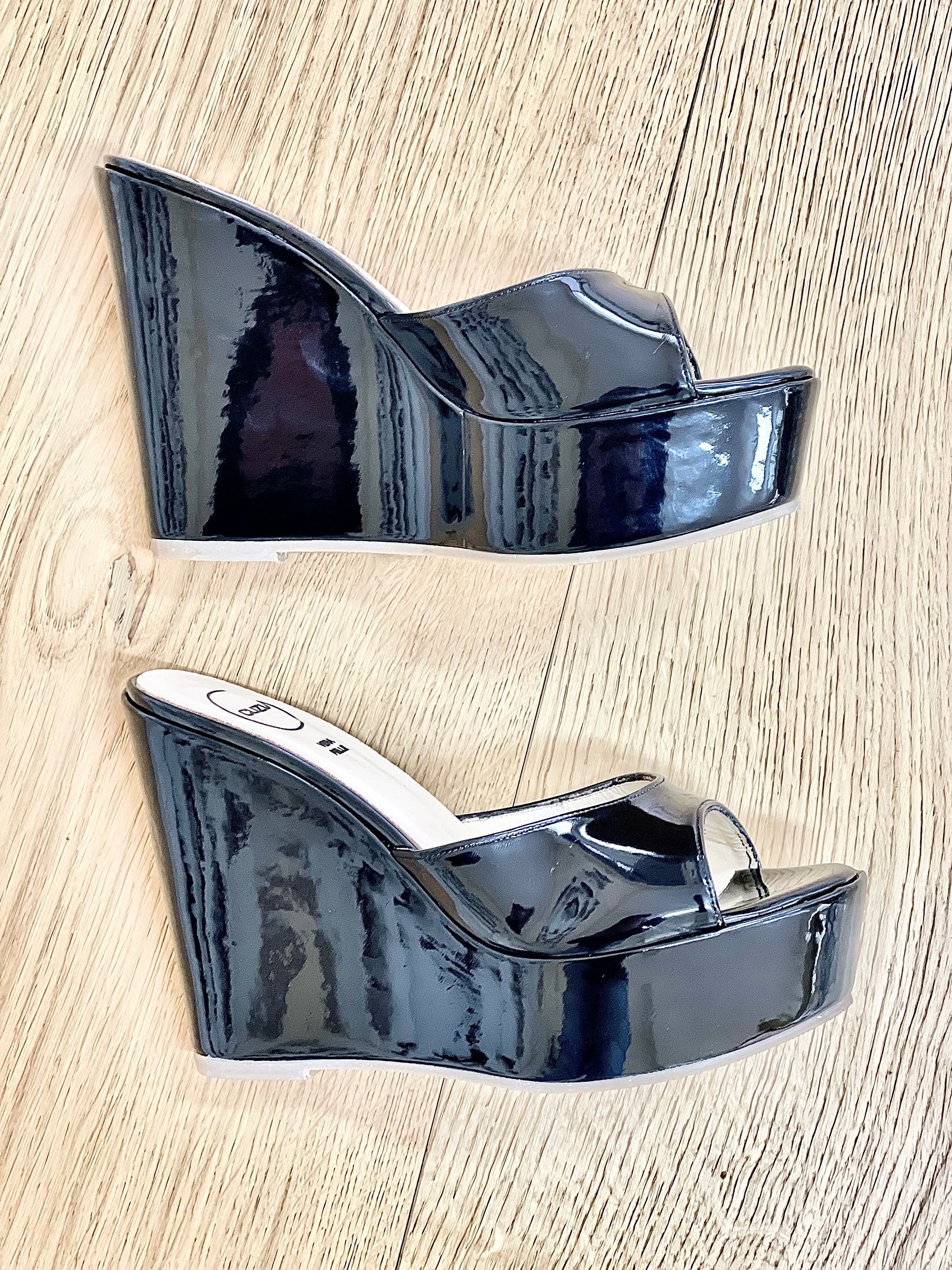 Hohe Pantoletten-Sandalen aus Lackleder mit Keil.