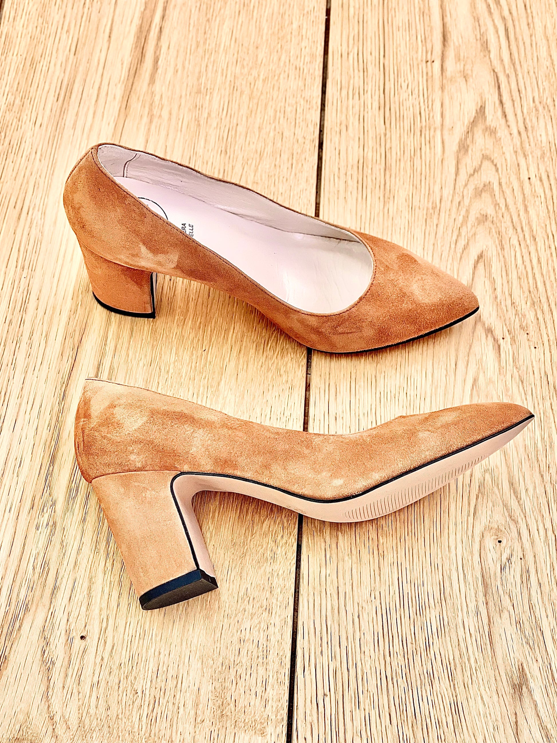 Spitz zulaufende Pumps aus Wildleder mit 75 mm Absatz.