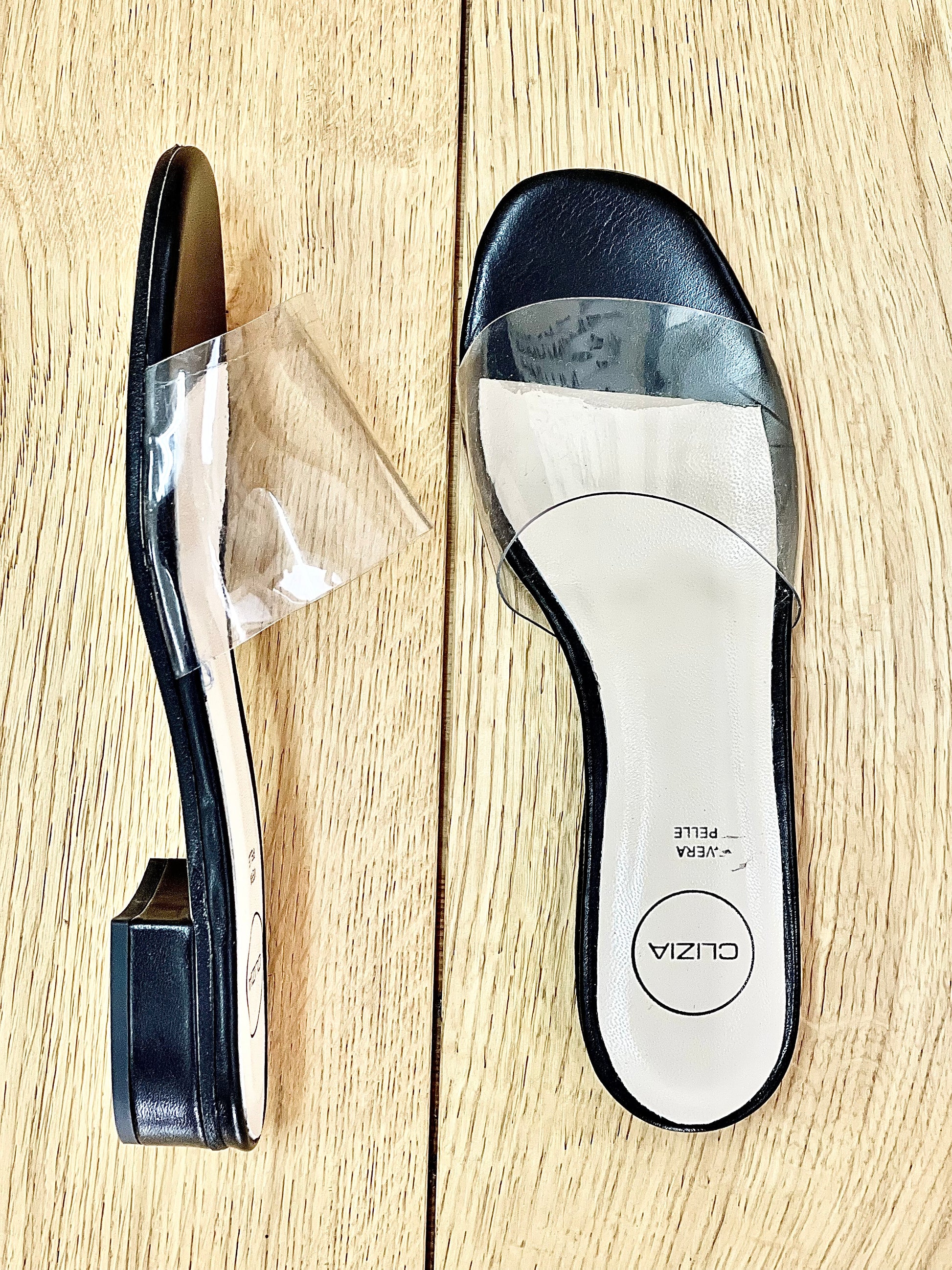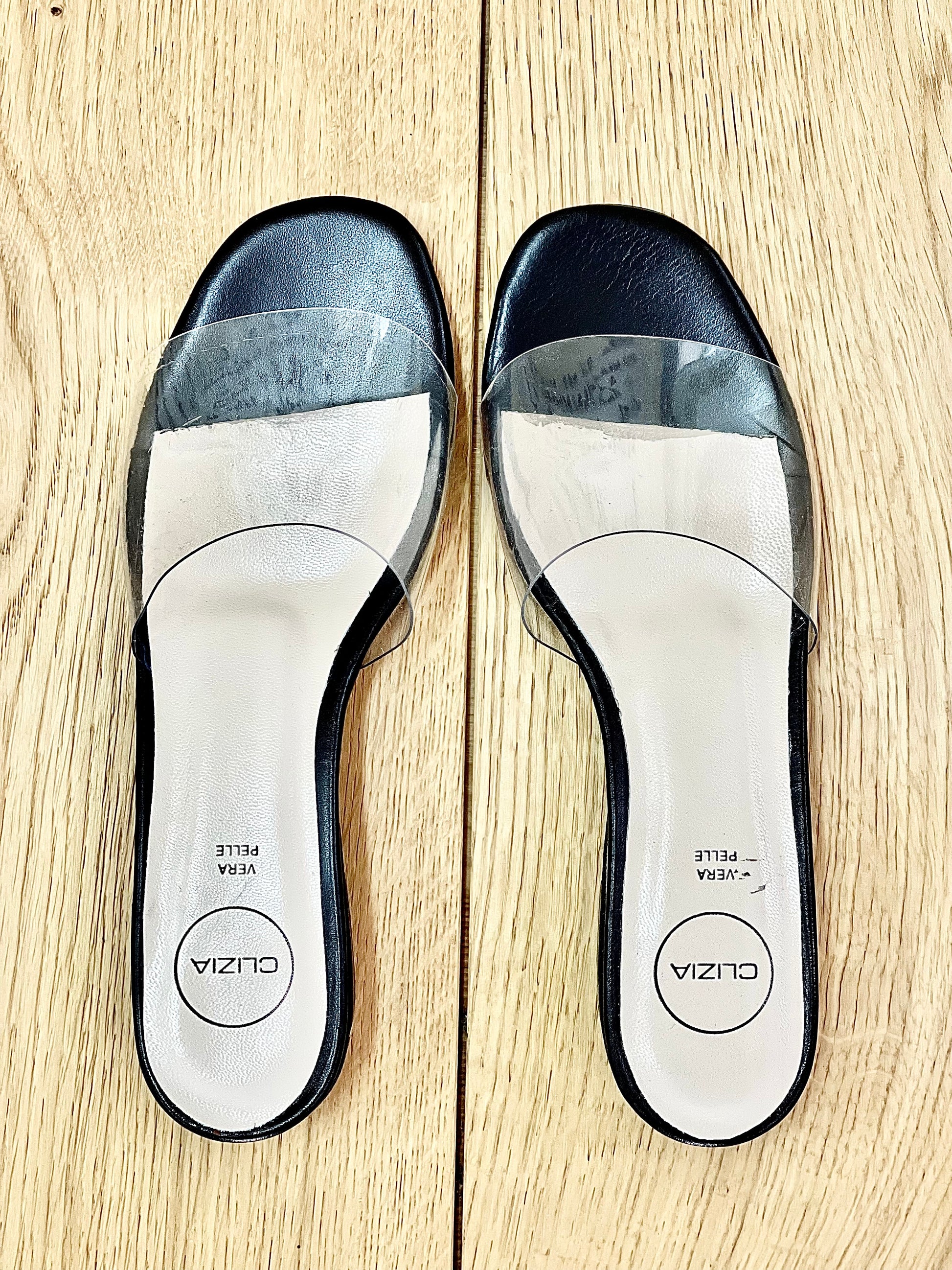 Niedrige Pantoletten-Sandalen aus PVC mit 2 cm Absatz.
