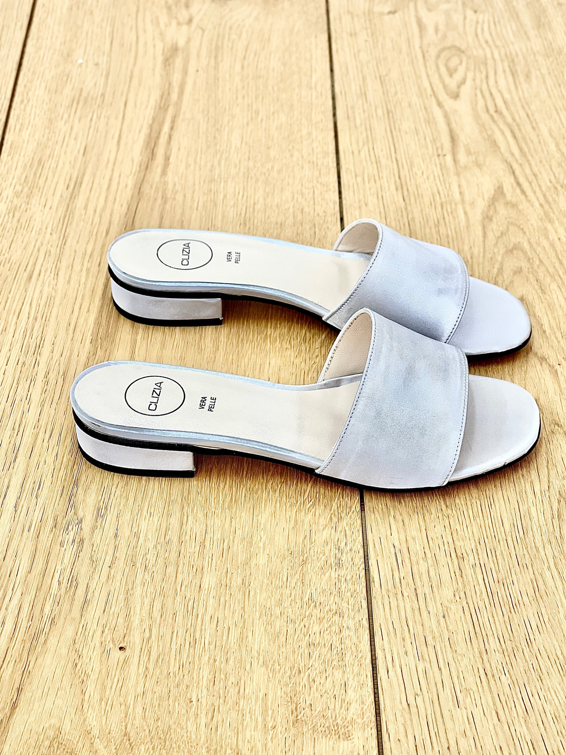 Niedrige Pantoletten-Sandalen aus Satin mit 2 cm breitem Absatz.